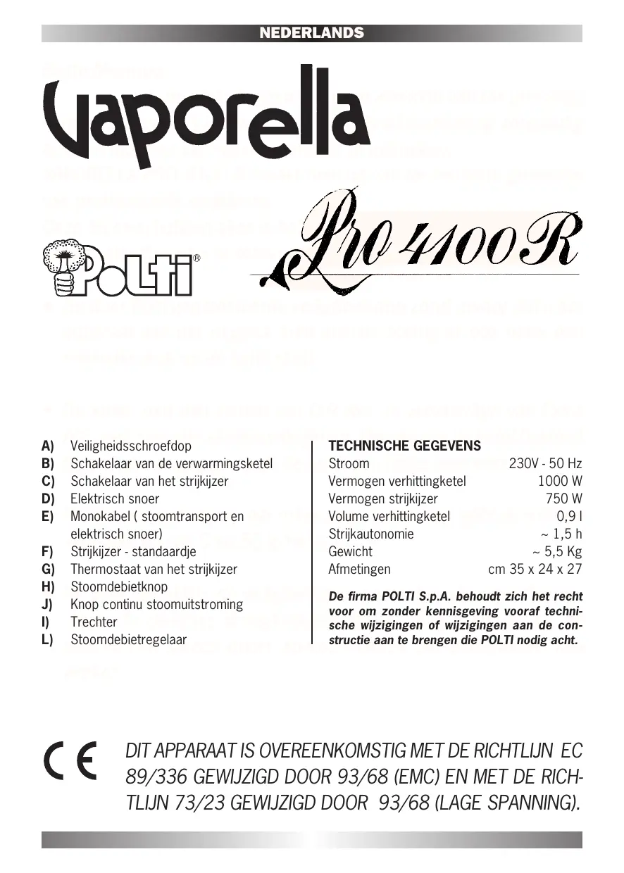 Schakelaar van het strijkijzer Vermogen verhittingketel 1000 W Elektrisch snoer Vermogen strijkijzer 750 W Monokabel stoomtransport Volume verhittingketel 0,9 l De hoeveelheid stoom per minuut kan tijdens het gebruik worden elektrisch snoer) Strijkautonomie ~ 1,5 h ingesteld tussen 0 en 50 g/minuut. Strijkijzer - standaardje Gewicht ~ 5,5 Kg Thermostaat van het strijkijzer Afmetingen cm 35 x 24 x 27 Stoomdebietknop De firma POLTI S.p.A. behoudt zichthermohet recht veiligheidsklep, de veiligheidsthermostaat en de extra Knop continu stoomuitstroming voor om zonder kennisgeving vooraf techniTrechterdie dient als droogkookbeveiliging, staat, zorgen ervooraandat sche wijzigingen of wijzigingen de conStoomdebietregelaar structie aan te brengen die POLTI nodig acht. VAPORELLA steeds onder absoluut veilige omstandigheden kan werken. DIT APPARAAT IS OVEREENKOMSTIG MET DE RICHTLIJN EC 89/336 GEWIJZIGD DOOR 93/68 (EMC) EN MET DE RICHTLIJN 73/23 GEWIJZIGD DOOR 93/68 (LAGE SPANNING). NEDERLANDS GEBRUIKSVOORSCHRIFTEN