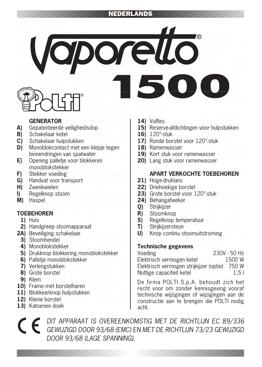 GEBRUIKSAANWIJZING VAPORETTO 1500 POLTI