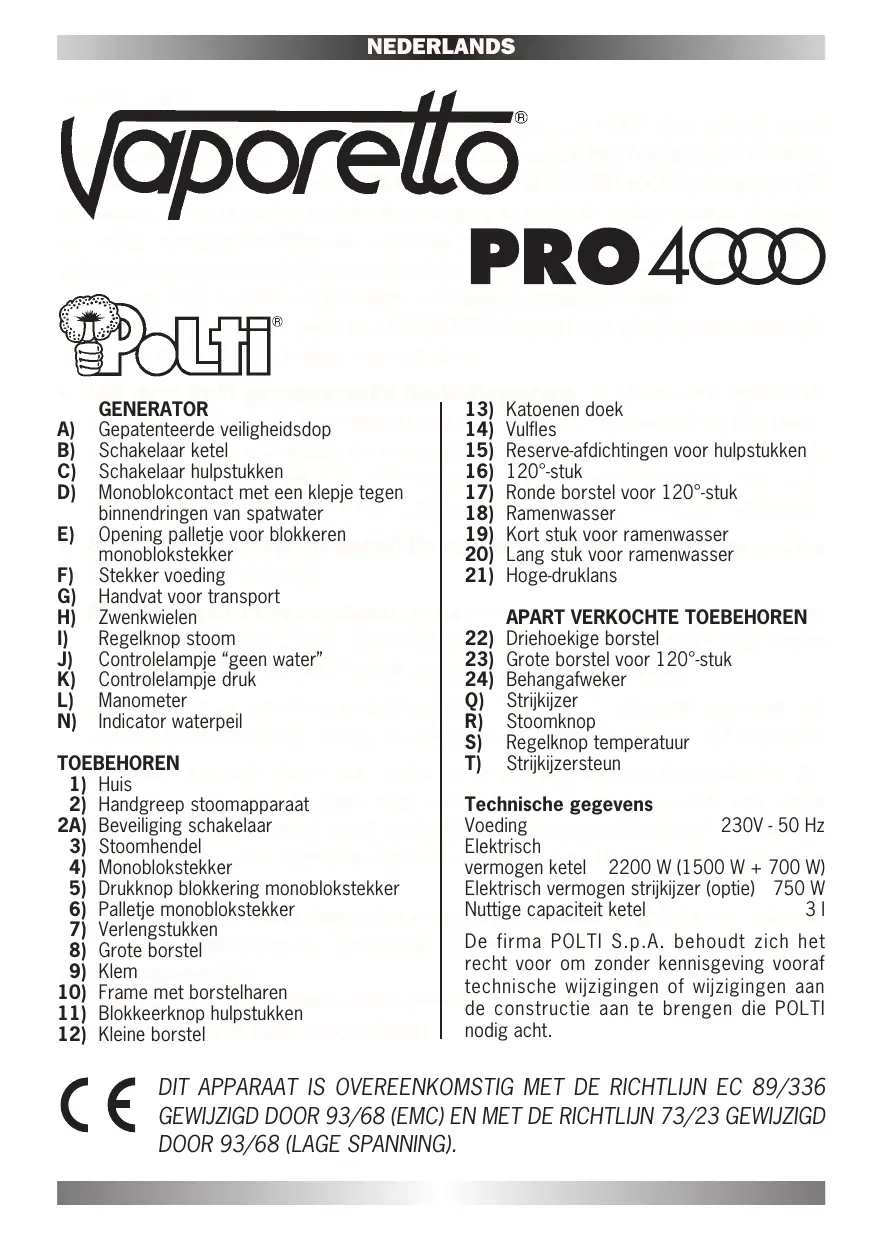 Stainless steel soleplate with 11 holes concentrated at the point. Indicator light to indicate selected temperature has been reached. Heat resistant iron rest. TRIANGULAR BRUSH (22) A new accessory whose shape allows access into the most difficult corners. LARGE BRUSH FOR 120° ACCESSORY (23) A very useful new accessory which allows the 120° steam nozzle to be used for cleaning larger surfaces. WALLPAPER STRIPPER TOOL (24) Specially designed for easy removal of wallpaper without significant wetting. NEDERLANDS Geachte relatie, Wij danken u voor het vertrouwen dat u in POLTI hebt gesteld bij de aankoop van dit produkt. U hebt daarmee bijgedragen aan de bescherming van het meest waardevolle goed om ons heen: DE NATUUR. VAPORETTO PRO 4000 lost in wezen alle problemen op die te maken hebben met reiniging en hygiëne, zonder gebruik te maken van giftige reinigingsmiddelen die schadelijk zijn voor het milieu. Gewoon kraanwater wordt omgezet in waterdamp met een constante krachtige druk. De VAPORETTO maakt gebruik van deze energie om grondiger en milieuvriendelijk te reinigen. Ons team van ontwerpers heeft de VAPORETTO uitgerust met instrumenten waarmee u uw werk efficiënter en veiliger kunt uitvoeren: