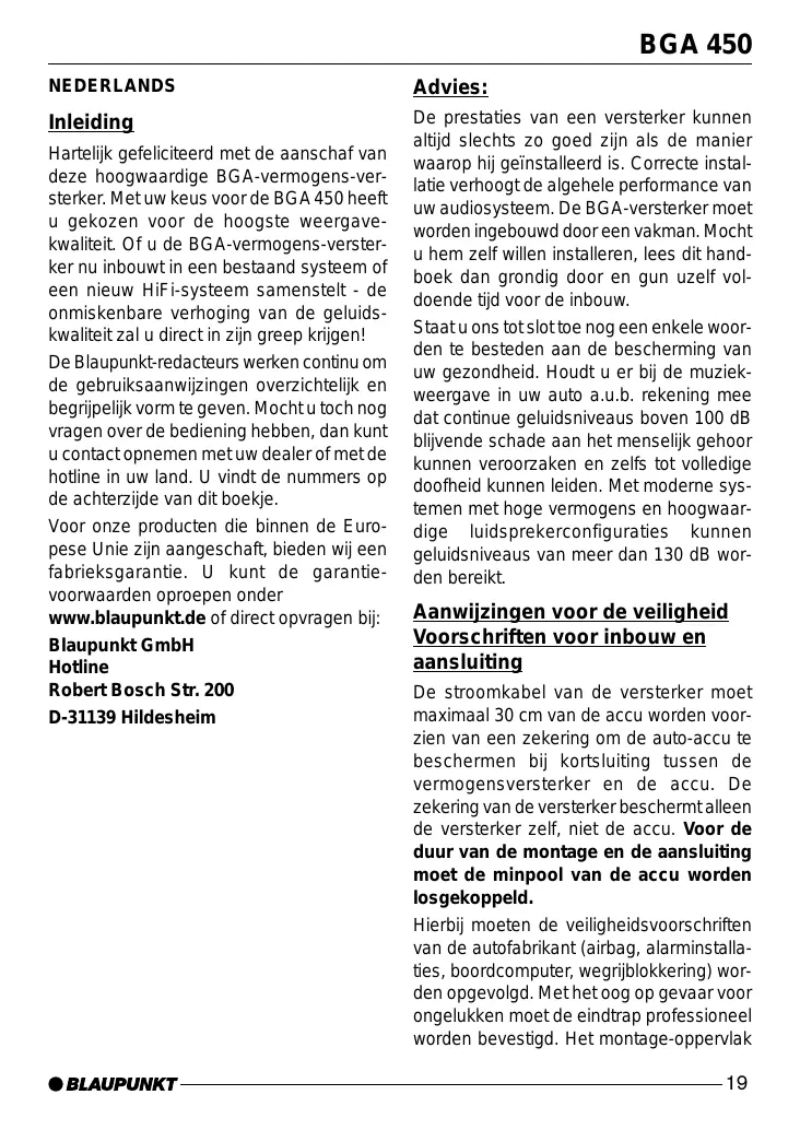 Hartelijk gefeliciteerd met de aanschaf van deze hoogwaardige BGA-vermogens-versterker. Met uw keus voor de BGA 450 heeft u gekozen voor de hoogste weergavekwaliteit. Of u de BGA-vermogens-versterker nu inbouwt in een bestaand systeem of een nieuw HiFi-systeem samenstelt - de onmiskenbare verhoging van de geluidskwaliteit zal u direct in zijn greep krijgen! De Blaupunkt-redacteurs werken continu om de gebruiksaanwijzingen overzichtelijk en begrijpelijk vorm te geven. Mocht u toch nog vragen over de bediening hebben, dan kunt u contact opnemen met uw dealer of met de hotline in uw land. U vindt de nummers op de achterzijde van dit boekje. Voor onze producten die binnen de Europese Unie zijn aangeschaft, bieden wij een fabrieksgarantie. U kunt de garantievoorwaarden oproepen onder www.blaupunkt.de of direct opvragen bij: Blaupunkt GmbH Hotline Robert Bosch Str. 200 D-31139 Hildesheim