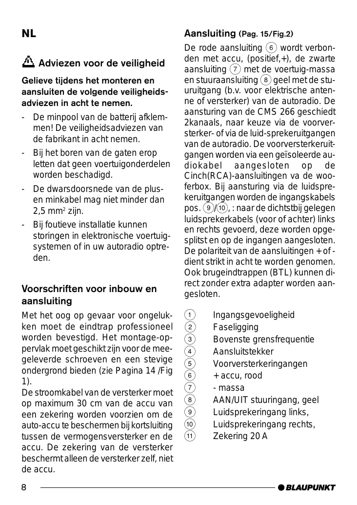 Aansluiting (Pag. 15/Fig.2) Adviezen voor de veiligheid Gelieve tijdens het monteren en aansluiten de volgende veiligheidsadviezen in acht te nemen. - De minpool van de batterij afklemmen! De veiligheidsadviezen van de fabrikant in acht nemen. - Bij het boren van de gaten erop letten dat geen voertuigonderdelen worden beschadigd. - De dwarsdoorsnede van de plusen minkabel mag niet minder dan 2,5 mm2 zijn. - Bij foutieve installatie kunnen storingen in elektronische voertuigsystemen of in uw autoradio optreden. Voorschriften voor inbouw en aansluiting Met het oog op gevaar voor ongelukken moet de eindtrap professioneel worden bevestigd. Het montage-oppervlak moet geschikt zijn voor de meegeleverde schroeven en een stevige ondergrond bieden (zie Pagina 14 /Fig 1). De stroomkabel van de versterker moet op maximum 30 cm van de accu van een zekering worden voorzien om de auto-accu te beschermen bij kortsluiting tussen de vermogensversterker en de accu. De zekering van de versterker beschermt alleen de versterker zelf, niet de accu.