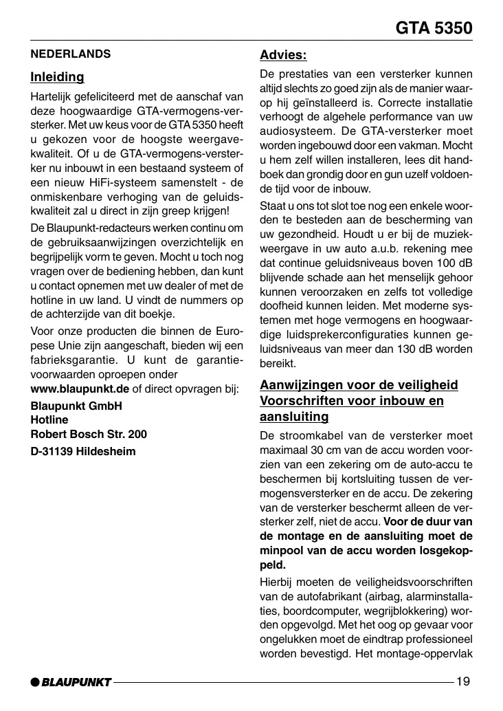 Hartelijk gefeliciteerd met de aanschaf van deze hoogwaardige GTA-vermogens-versterker. Met uw keus voor de GTA 5350 heeft u gekozen voor de hoogste weergavekwaliteit. Of u de GTA-vermogens-versterker nu inbouwt in een bestaand systeem of een nieuw HiFi-systeem samenstelt - de onmiskenbare verhoging van de geluidskwaliteit zal u direct in zijn greep krijgen! De Blaupunkt-redacteurs werken continu om de gebruiksaanwijzingen overzichtelijk en begrijpelijk vorm te geven. Mocht u toch nog vragen over de bediening hebben, dan kunt u contact opnemen met uw dealer of met de hotline in uw land. U vindt de nummers op de achterzijde van dit boekje. Voor onze producten die binnen de Europese Unie zijn aangeschaft, bieden wij een fabrieksgarantie. U kunt de garantievoorwaarden oproepen onder www.blaupunkt.de of direct opvragen bij: Blaupunkt GmbH Hotline Robert Bosch Str. 200 D-31139 Hildesheim