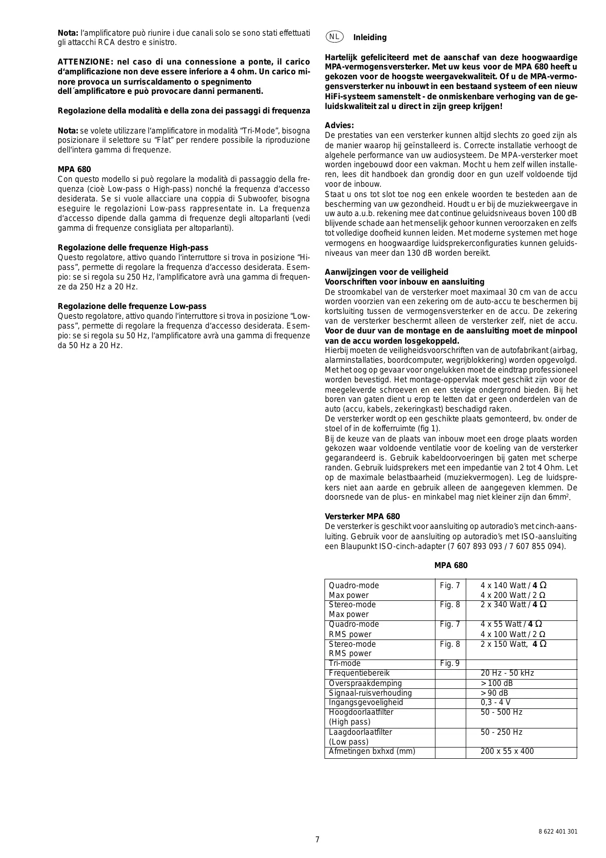 Versterker MPA 680 De versterker is geschikt voor aansluiting op autoradio’s met cinch-aansluiting. Gebruik voor de aansluiting op autoradio’s met ISO-aansluiting een Blaupunkt ISO-cinch-adapter (7 607 893 093 / 7 607 855 094). MPA 680 Quadro-mode Max power Stereo-mode Max power Quadro-mode RMS power Stereo-mode RMS power Tri-mode Frequentiebereik Overspraakdemping Signaal-ruisverhouding Ingangsgevoeligheid Hoogdoorlaatfilter (High pass) Laagdoorlaatfilter (Low pass) Afmetingen bxhxd (mm)