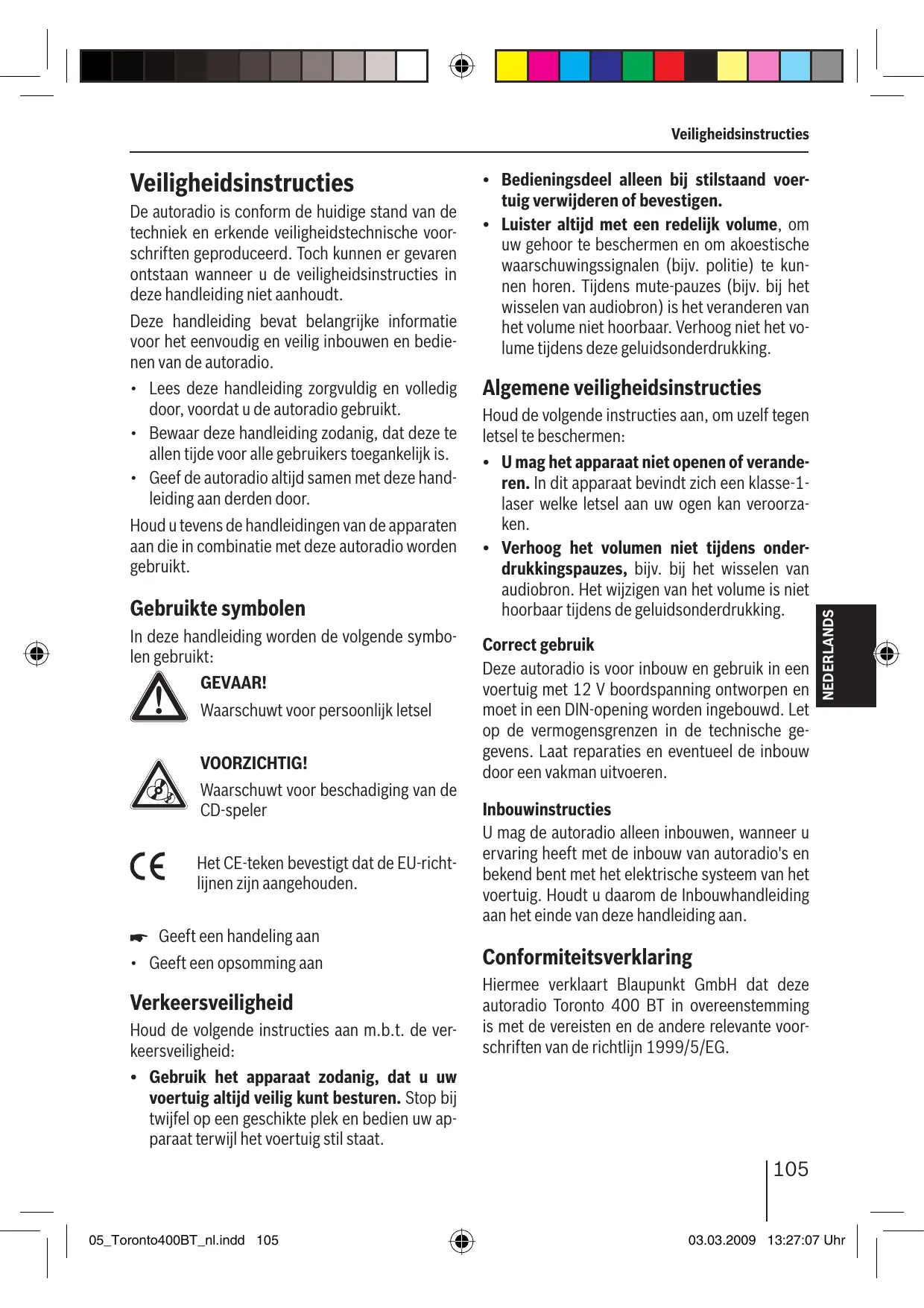 Conformiteitsverklaring Hiermee verklaart Blaupunkt GmbH dat deze autoradio Toronto 400 BT in overeenstemming is met de vereisten en de andere relevante voorschriften van de richtlijn 1999/5/EG.
