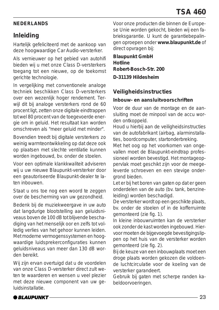 TSA 460 NEDERLANDS Inleiding Hartelijk gefeliciteerd met de aankoop van deze hoogwaardige Car Audio-versterker. Als vernieuwer op het gebied van autohifi bieden wij u met onze Class D-versterkers toegang tot een nieuwe, op de toekomst gerichte technologie. In vergelijking met conventionele analoge techniek beschikken Class D-versterkers over een wezenlijk hoger rendement. Terwijl dit bij analoge versterkers rond de 60 procent ligt, zetten onze digitale eindtrappen tot wel 80 procent van de toegevoerde energie om in geluid. Het resultaat kan worden omschreven als "meer geluid met minder". Bovendien treedt bij digitale versterkers zo weinig warmteontwikkeling op dat deze ook op plaatsen met slechte ventilatie kunnen worden ingebouwd, bv. onder de stoelen. Voor een optimale klankkwaliteit adviseren wij u uw nieuwe Blaupunkt-versterker door een geautoriseerde Blaupunkt-dealer te laten inbouwen. Staat u ons toe nog een woord te zeggen over de bescherming van uw gezondheid. Bedenk bij de muziekweergave in uw auto dat langdurige blootstelling aan geluidsniveaus boven de 100 dB tot blijvende beschadiging van het menselijk oor en zelfs tot volledig verlies van het gehoor kunnen leiden. Met moderne vermogenssystemen en hoogwaardige luidsprekerconfiguraties kunnen geluidsniveaus van meer dan 130 dB worden bereikt. Wij zijn ervan overtuigd dat u de voordelen van onze Class D-versterker direct zult weten te waarderen en wensen u veel plezier met deze nieuwe component van uw geluidsinstallatie. Voor onze producten die binnen de Europese Unie worden gekocht, bieden wij een fabrieksgarantie. U kunt de garantiebepalingen oproepen onder www.blaupunkt.de of direct opvragen bij: Blaupunkt GmbH Hotline Robert-Bosch-Str. 200 D-31139 Hildesheim Veiligheidsinstructies Inbouw- en aansluitvoorschriften Voor de duur van de montage en de aansluiting moet de minpool van de accu worden ontkoppeld. Houd u hierbij aan de veiligheidsinstructies van de autofabrikant (airbag, alarminstallaties, boordcomputer, startonderbreking. Met het oog op het voorkomen van ongevallen moet de Blaupunkt-eindtrap professioneel worden bevestigd. Het montageoppervlak moet geschikt zijn voor de meegeleverde schroeven en een stevige ondergrond bieden. Let er bij het boren van gaten op dat er geen onderdelen van de auto (bv. tank, benzineleiding) worden beschadigd. De versterker wordt op een geschikte plaats, bv. onder de stoelen of in de kofferruimte gemonteerd (zie fig. 1). In kleine inbouwruimten kan de versterker ook zonder de kast worden ingebouwd. Hiervoor moeten de bijgevoegde bevestigingslippen op het huis van de versterker worden gemonteerd (zie fig. 2). Bij de keuze van een inbouwplaats moet een droge plaats worden gekozen die voldoende luchtcirculatie voor de koeling van de versterker garandeert. Gebruik bij gaten met scherpe randen kabeldoorvoeringen.
