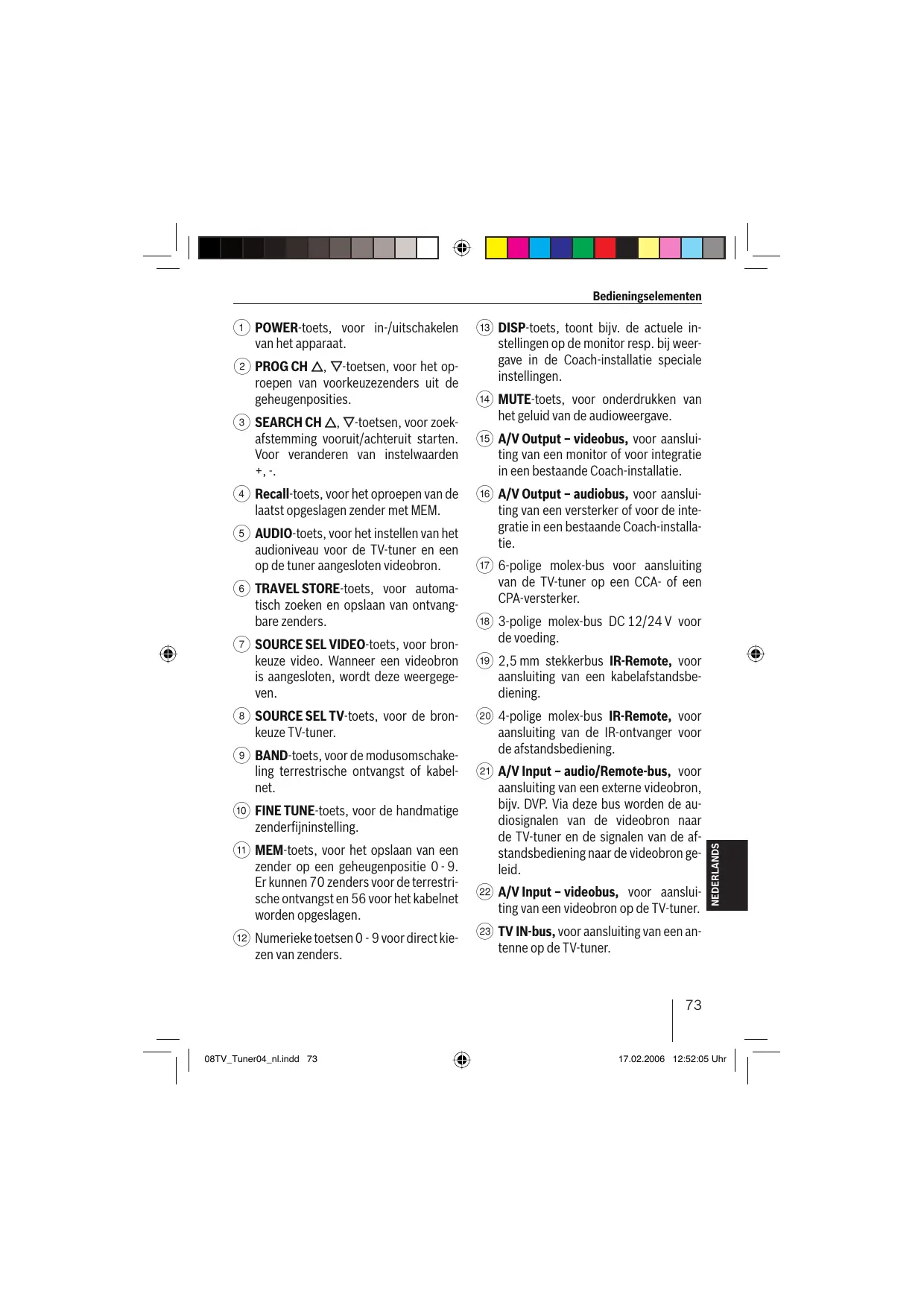 16 A/V Output - audiobus, voor aanslui- ting van een versterker of voor de integ- gratie in een bestaande Coach-installatie.