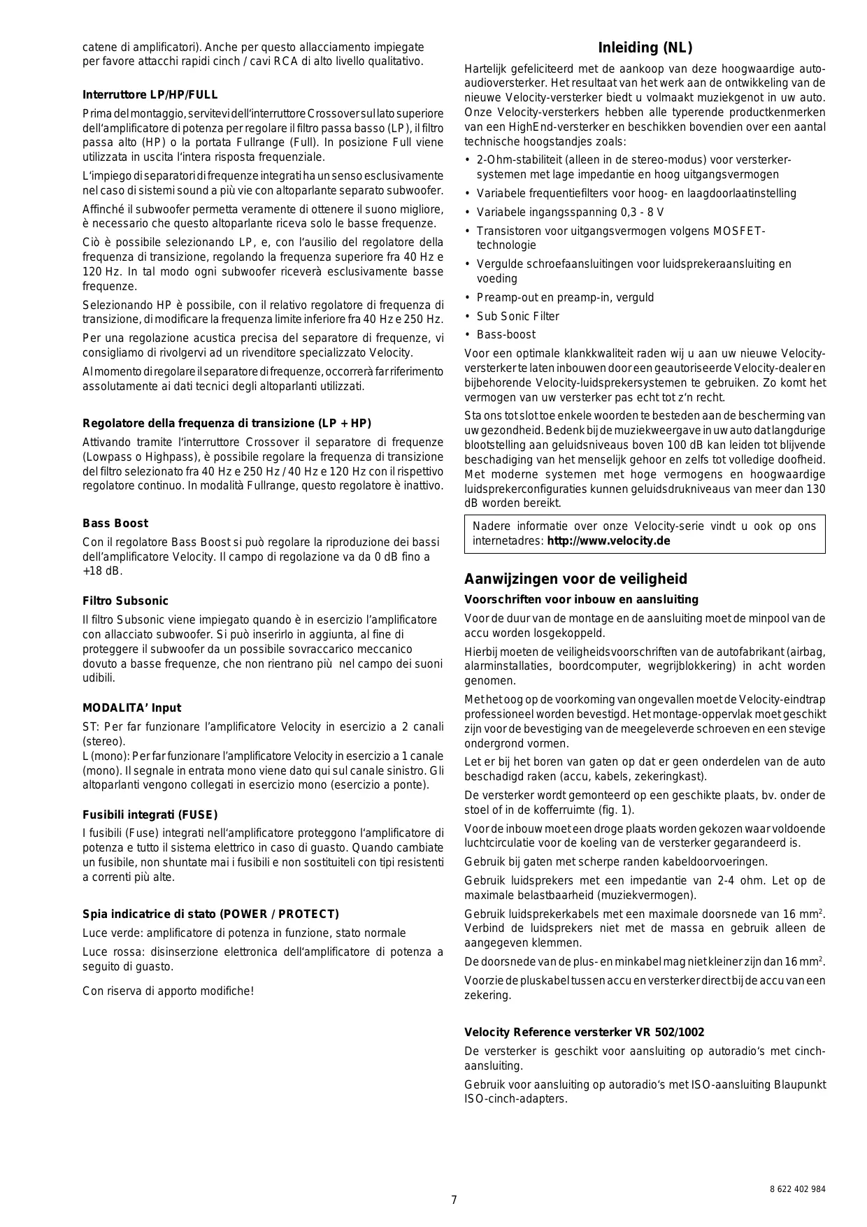 Hartelijk gefeliciteerd met de aankoop van deze hoogwaardige autoaudioversterker. Het resultaat van het werk aan de ontwikkeling van de nieuwe Velocity-versterker biedt u volmaakt muziekgenot in uw auto. Onze Velocity-versterkers hebben alle typerende productkenmerken van een HighEnd-versterker en beschikken bovendien over een aantal technische hoogstandjes zoals: