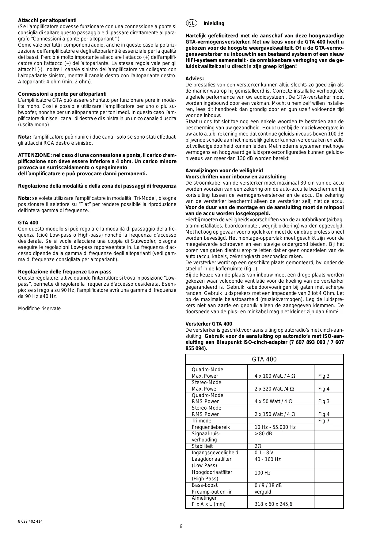Hartelijk gefeliciteerd met de aanschaf van deze hoogwaardige GTA-vermogensversterker. Met uw keus voor de GTA 400 heeft u gekozen voor de hoogste weergavekwaliteit. Of u de GTA-vermogensversterker nu inbouwt in een bestaand systeem of een nieuw HiFi-systeem samenstelt - de onmiskenbare verhoging van de geluidskwaliteit zal u direct in zijn greep krijgen! Advies: De prestaties van een versterker kunnen altijd slechts zo goed zijn als de manier waarop hij geïnstalleerd is. Correcte installatie verhoogt de algehele performance van uw audiosysteem. De GTA-versterker moet worden ingebouwd door een vakman. Mocht u hem zelf willen installeren, lees dit handboek dan grondig door en gun uzelf voldoende tijd voor de inbouw. Staat u ons tot slot toe nog een enkele woorden te besteden aan de bescherming van uw gezondheid. Houdt u er bij de muziekweergave in uw auto a.u.b. rekening mee dat continue geluidsniveaus boven 100 dB blijvende schade aan het menselijk gehoor kunnen veroorzaken en zelfs tot volledige doofheid kunnen leiden. Met moderne systemen met hoge vermogens en hoogwaardige luidsprekerconfiguraties kunnen geluidsniveaus van meer dan 130 dB worden bereikt.