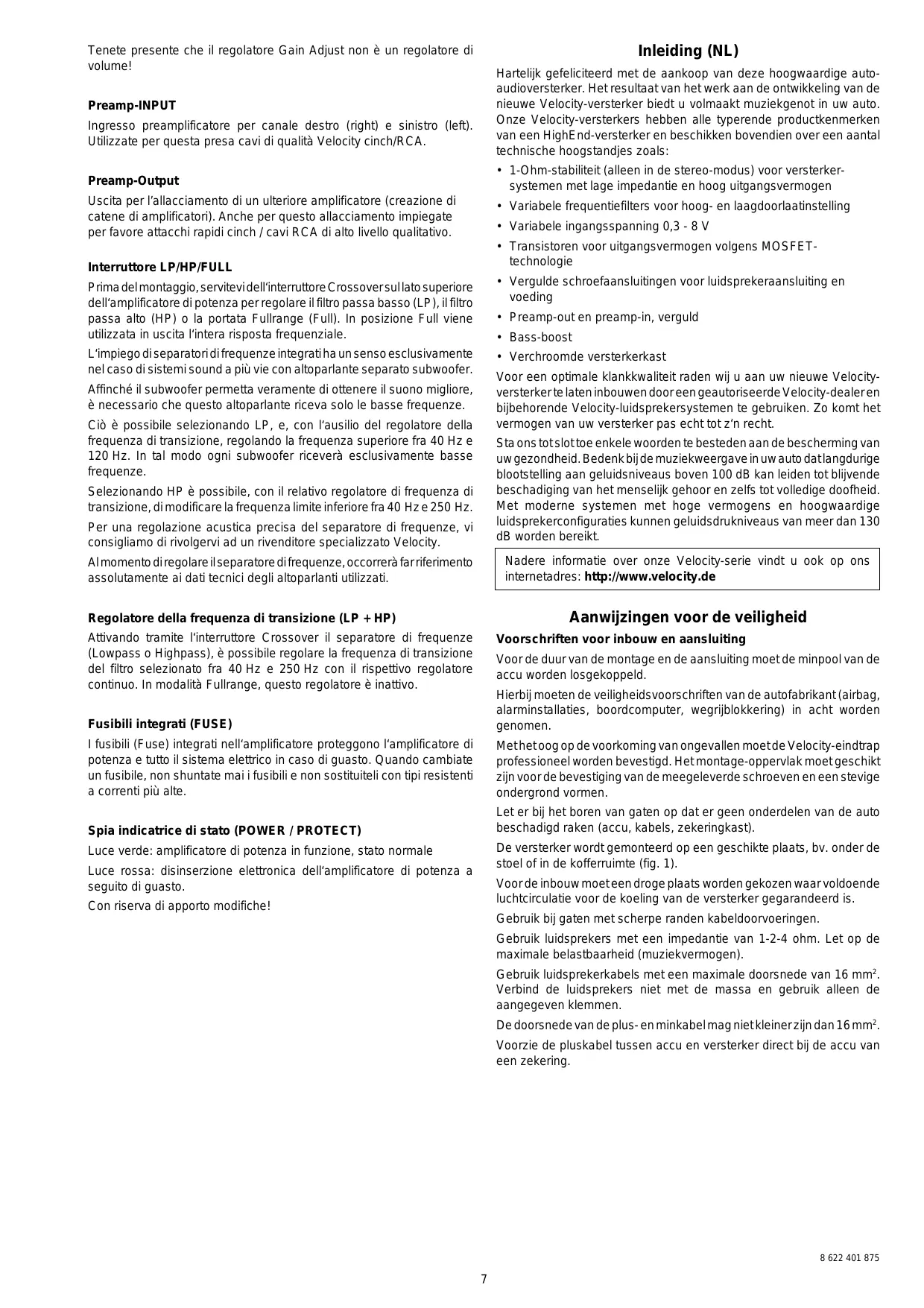 Hartelijk gefeliciteerd met de aankoop van deze hoogwaardige autoaudioversterker. Het resultaat van het werk aan de ontwikkeling van de nieuwe Velocity-versterker biedt u volmaakt muziekgenot in uw auto. Onze Velocity-versterkers hebben alle typerende productkenmerken van een HighEnd-versterker en beschikken bovendien over een aantal technische hoogstandjes zoals: