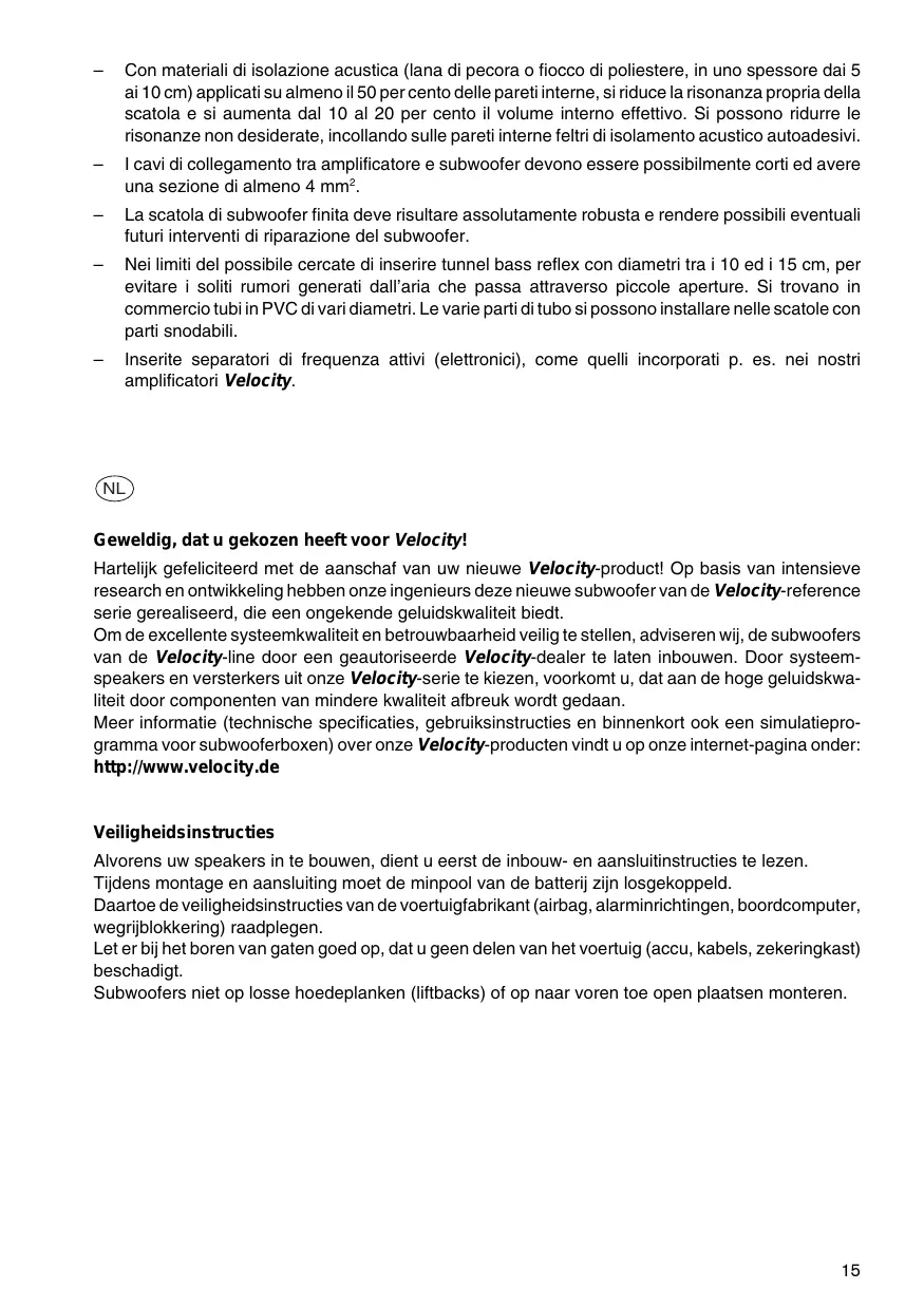 NL Geweldig, dat u gekozen heeft voor Velocity! Hartelijk gefeliciteerd met de aanschaf van uw nieuwe Velocity-product! Op basis van intensieve research en ontwikkeling hebben onze ingenieurs deze nieuwe subwoofer van de Velocity-reference serie gerealiseerd, die een ongekende geluidskwaliteit biedt. Om de excellente systeemkwaliteit en betrouwbaarheid veilig te stellen, adviseren wij, de subwoofers van de Velocity-line door een geautoriseerde Velocity-dealer te laten inbouwen. Door systeemspeakers en versterkers uit onze Velocity-serie te kiezen, voorkomt u, dat aan de hoge geluidskwaliteit door componenten van mindere kwaliteit afbreuk wordt gedaan. Meer informatie (technische specificaties, gebruiksinstructies en binnenkort ook een simulatieprogramma voor subwooferboxen) over onze Velocity-producten vindt u op onze internet-pagina onder: http://www.velocity.de