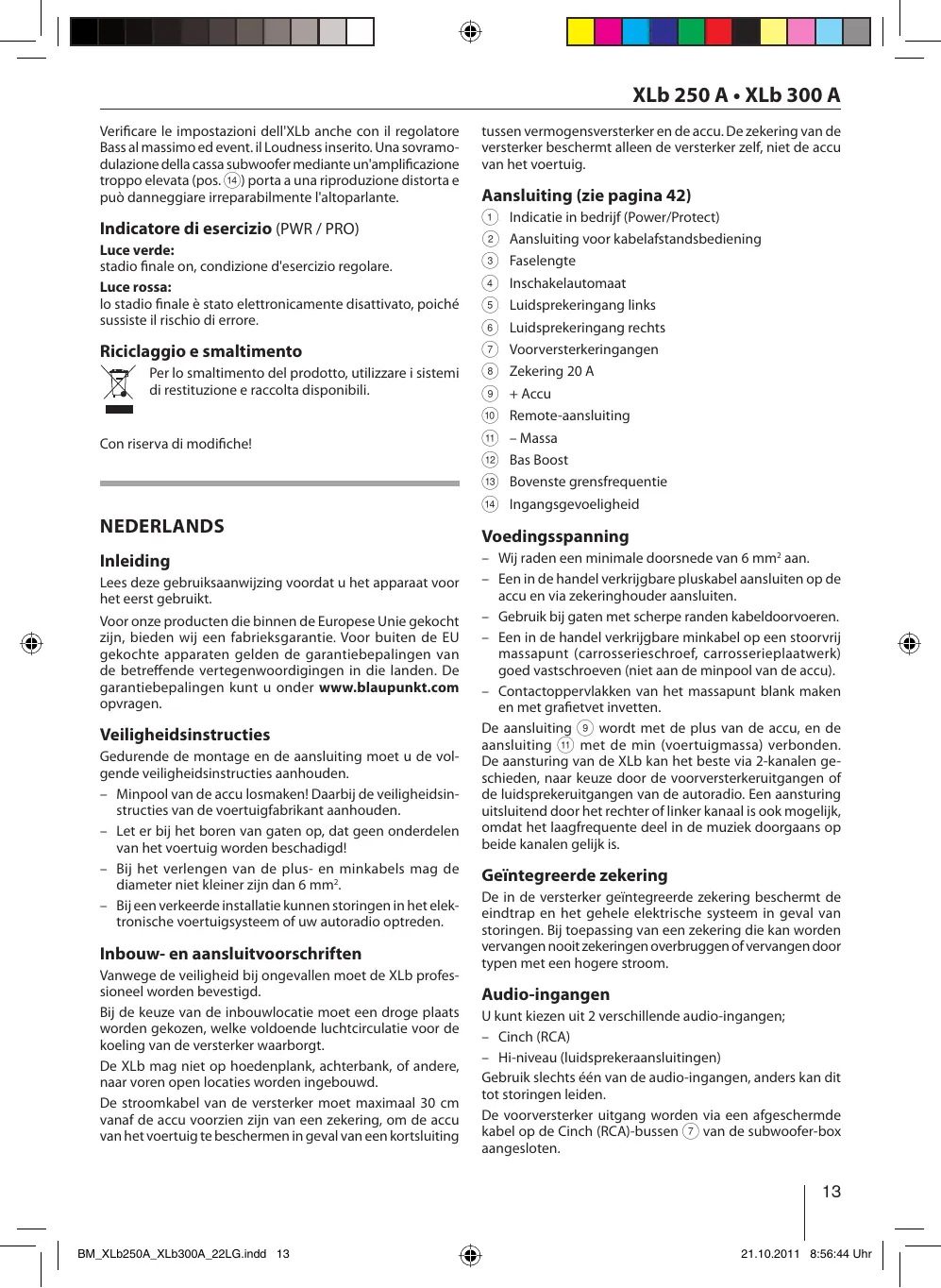 Download de handleiding voor uw Autoversterker in PDF-formaat gratis! Vind uw handleiding BLUE MAGIC XLB 300 A - BLAUPUNKT en neem uw elektronisch apparaat weer in handen. Op deze pagina staan alle documenten die nodig zijn voor het gebruik van uw apparaat. BLUE MAGIC XLB 300 A van het merk BLAUPUNKT.