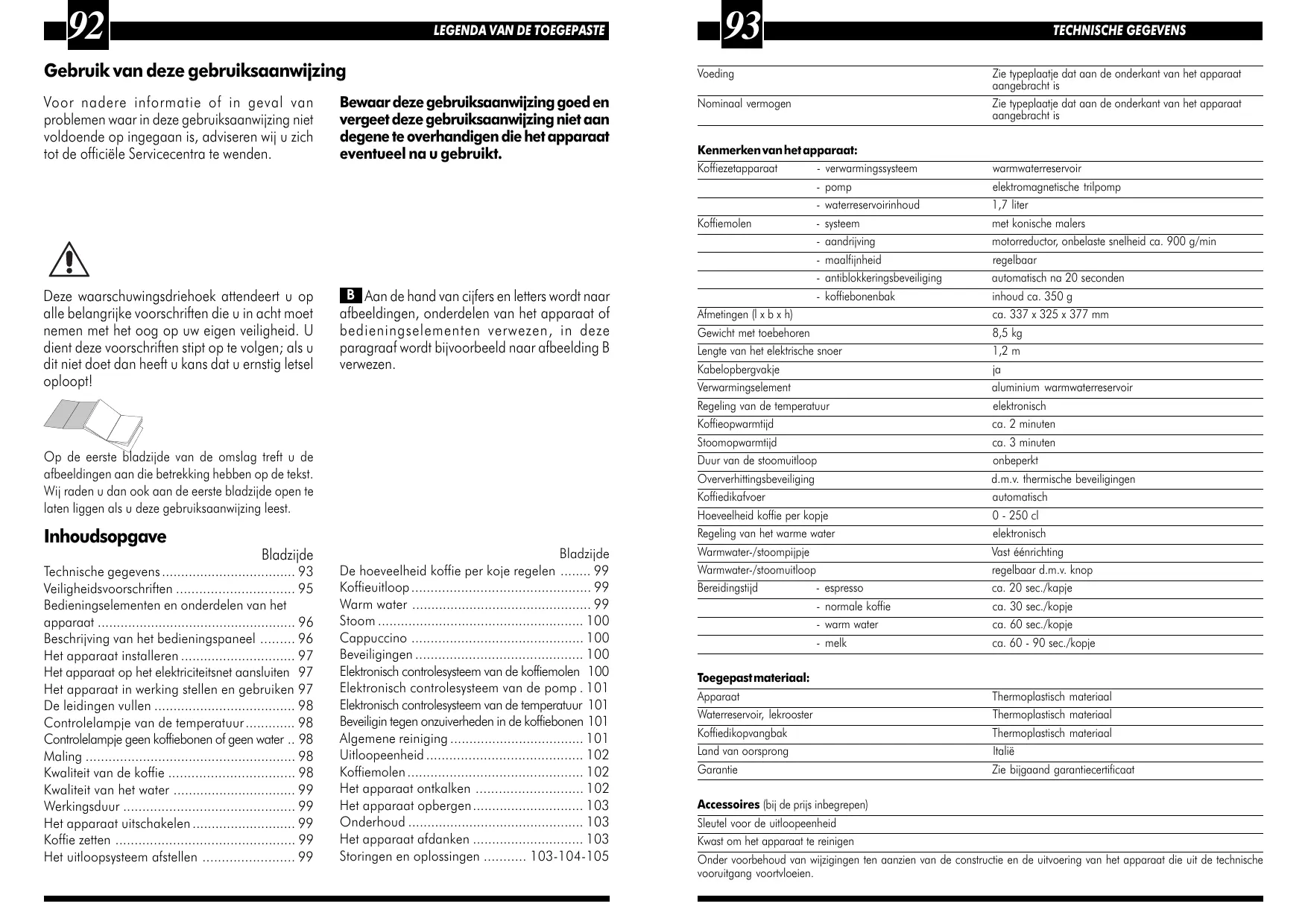 Eau chaude 43 Vapeur 44 Contrôle électronique de la température 45 Détecteur de pierrettes du café en grains 45 Nettoyage 45 Unité centrale 45 Moulin à café 46 Détartrage 46 - système de chauffage - pompe - réservoir à eau Moulin à café - système - mise en service - finesse de moulure - protection antiblocage - réservoir café en grains Dimensions (long.xlarg.xhaut.) Poids avec les accessoires Longueur du câble dalimentation Vache pour de lenrouleur de câble Elément réchauffant Réglage de la température Durée de réchauffage Durée de réchauffage pour vapeur Durée de distribution de vapeur Protection contre la surchauffe Ejection du marc de café Quantité de café par tasse Contrôle de leau chaude Buse deau chaude/vapeur Prélèvement deau chaude/vapeur Durée de préparation - espresso Bac à marc Pays dorigine Garantie du produit