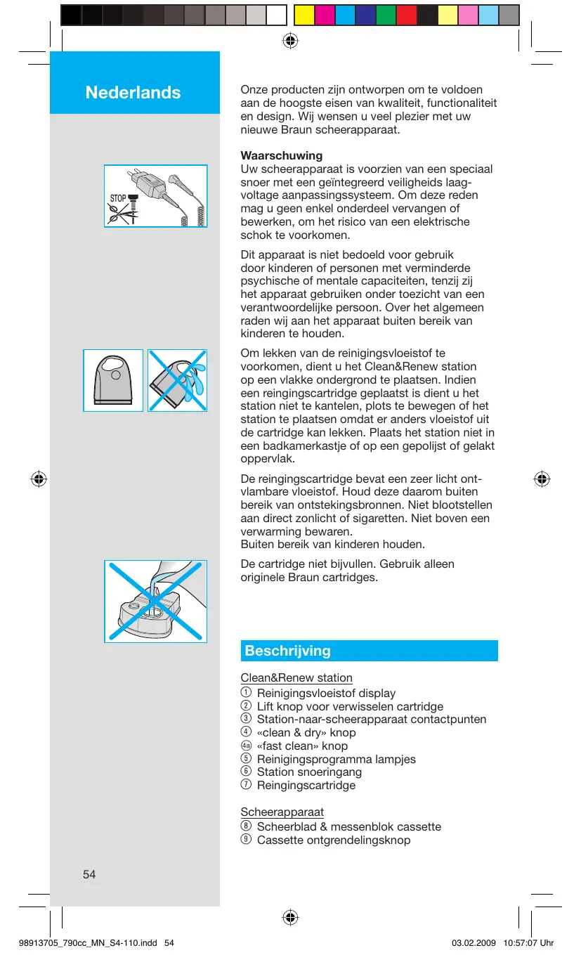 Nederlands STOP Onze producten zijn ontworpen om te voldoen aan de hoogste eisen van kwaliteit, functionaliteit en design. Wij wensen u veel plezier met uw nieuwe Braun scheerapparaat. Waarschuwing Uw scheerapparaat is voorzien van een speciaal snoer met een geïntegreerd veiligheids laagvoltage aanpassingssysteem. Om deze reden mag u geen enkel onderdeel vervangen of bewerken, om het risico van een elektrische schok te voorkomen. Dit apparaat is niet bedoeld voor gebruik door kinderen of personen met verminderde psychische of mentale capaciteiten, tenzij zij het apparaat gebruiken onder toezicht van een verantwoordelijke persoon. Over het algemeen raden wij aan het apparaat buiten bereik van kinderen te houden. Om lekken van de reinigingsvloeistof te voorkomen, dient u het Clean&Renew station op een vlakke ondergrond te plaatsen. Indien een reingingscartridge geplaatst is dient u het station niet te kantelen, plots te bewegen of het station te plaatsen omdat er anders vloeistof uit de cartridge kan lekken. Plaats het station niet in een badkamerkastje of op een gepolijst of gelakt oppervlak. De reingingscartridge bevat een zeer licht ontvlambare vloeistof. Houd deze daarom buiten bereik van ontstekingsbronnen. Niet blootstellen aan direct zonlicht of sigaretten. Niet boven een verwarming bewaren. Buiten bereik van kinderen houden. De cartridge niet bijvullen. Gebruik alleen originele Braun cartridges. Beschrijving Clean&Renew station 1 Reinigingsvloeistof display 2 Lift knop voor verwisselen cartridge 3 Station-naar-scheerapparaat contactpunten 4 «clean & dry» knop D «fast clean» knop 5 Reinigingsprogramma lampjes 6 Station snoeringang 7 Reingingscartridge Scheerapparaat 8 Scheerblad & messenblok cassette 9 Cassette ontgrendelingsknop