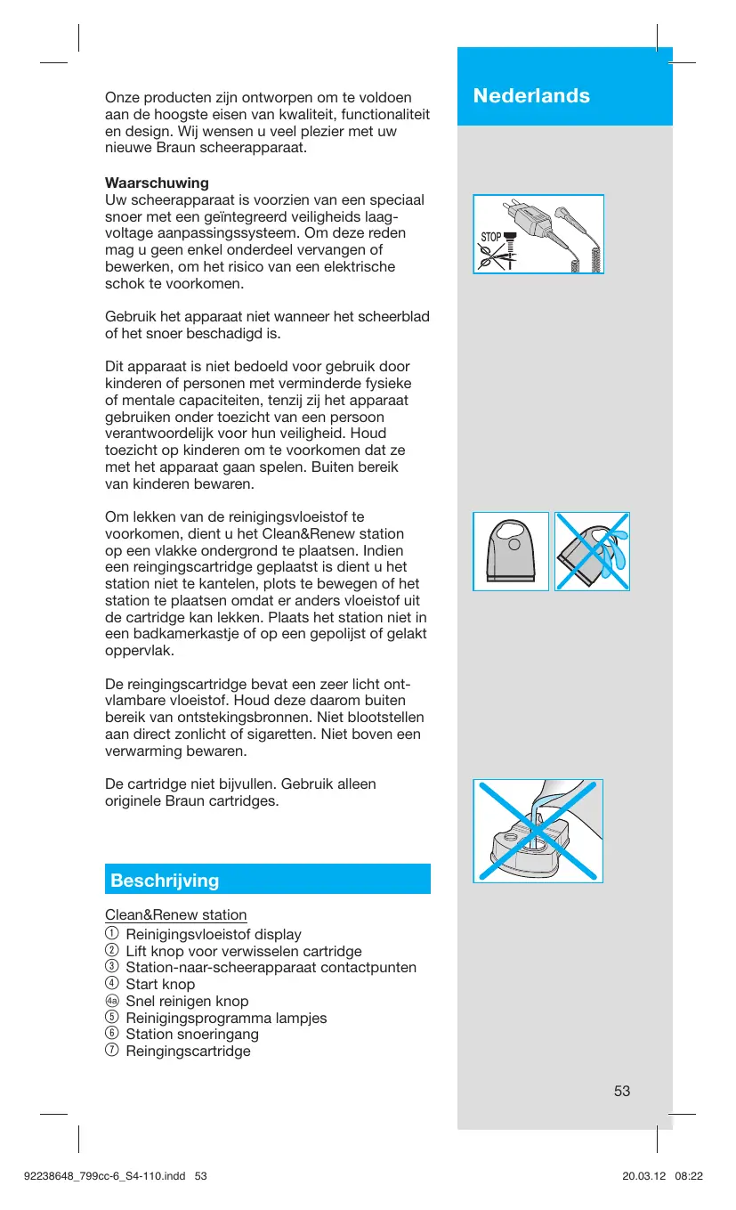 Onze producten zijn ontworpen om te voldoen aan de hoogste eisen van kwaliteit, functionaliteit en design. Wij wensen u veel plezier met uw nieuwe Braun scheerapparaat. Waarschuwing Uw scheerapparaat is voorzien van een speciaal snoer met een geïntegreerd veiligheids laagvoltage aanpassingssysteem. Om deze reden mag u geen enkel onderdeel vervangen of bewerken, om het risico van een elektrische schok te voorkomen. Nederlands STOP Gebruik het apparaat niet wanneer het scheerblad of het snoer beschadigd is. Dit apparaat is niet bedoeld voor gebruik door kinderen of personen met verminderde fysieke of mentale capaciteiten, tenzij zij het apparaat gebruiken onder toezicht van een persoon verantwoordelijk voor hun veiligheid. Houd toezicht op kinderen om te voorkomen dat ze met het apparaat gaan spelen. Buiten bereik van kinderen bewaren. Om lekken van de reinigingsvloeistof te voorkomen, dient u het Clean&Renew station op een vlakke ondergrond te plaatsen. Indien een reingingscartridge geplaatst is dient u het station niet te kantelen, plots te bewegen of het station te plaatsen omdat er anders vloeistof uit de cartridge kan lekken. Plaats het station niet in een badkamerkastje of op een gepolijst of gelakt oppervlak. De reingingscartridge bevat een zeer licht ontvlambare vloeistof. Houd deze daarom buiten bereik van ontstekingsbronnen. Niet blootstellen aan direct zonlicht of sigaretten. Niet boven een verwarming bewaren. De cartridge niet bijvullen. Gebruik alleen originele Braun cartridges. Beschrijving Clean&Renew station 1 Reinigingsvloeistof display 2 Lift knop voor verwisselen cartridge 3 Station-naar-scheerapparaat contactpunten 4 Start knop D Snel reinigen knop 5 Reinigingsprogramma lampjes 6 Station snoeringang 7 Reingingscartridge
