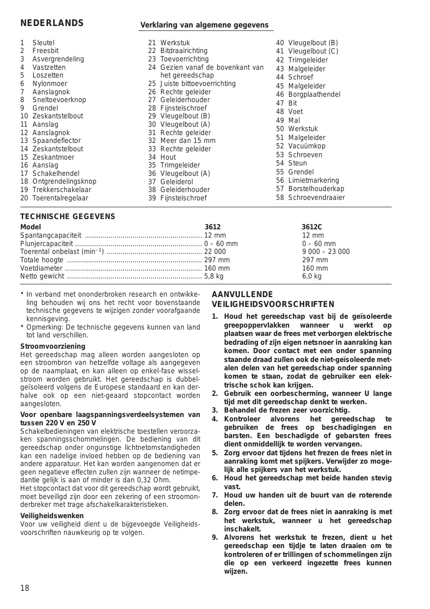 16. Zorg ervoor dat u uitsluitend frezen gebruikt die de juiste schachtdiameter hebben en geschikt zijn voor de snelheïd van het gereedschap.