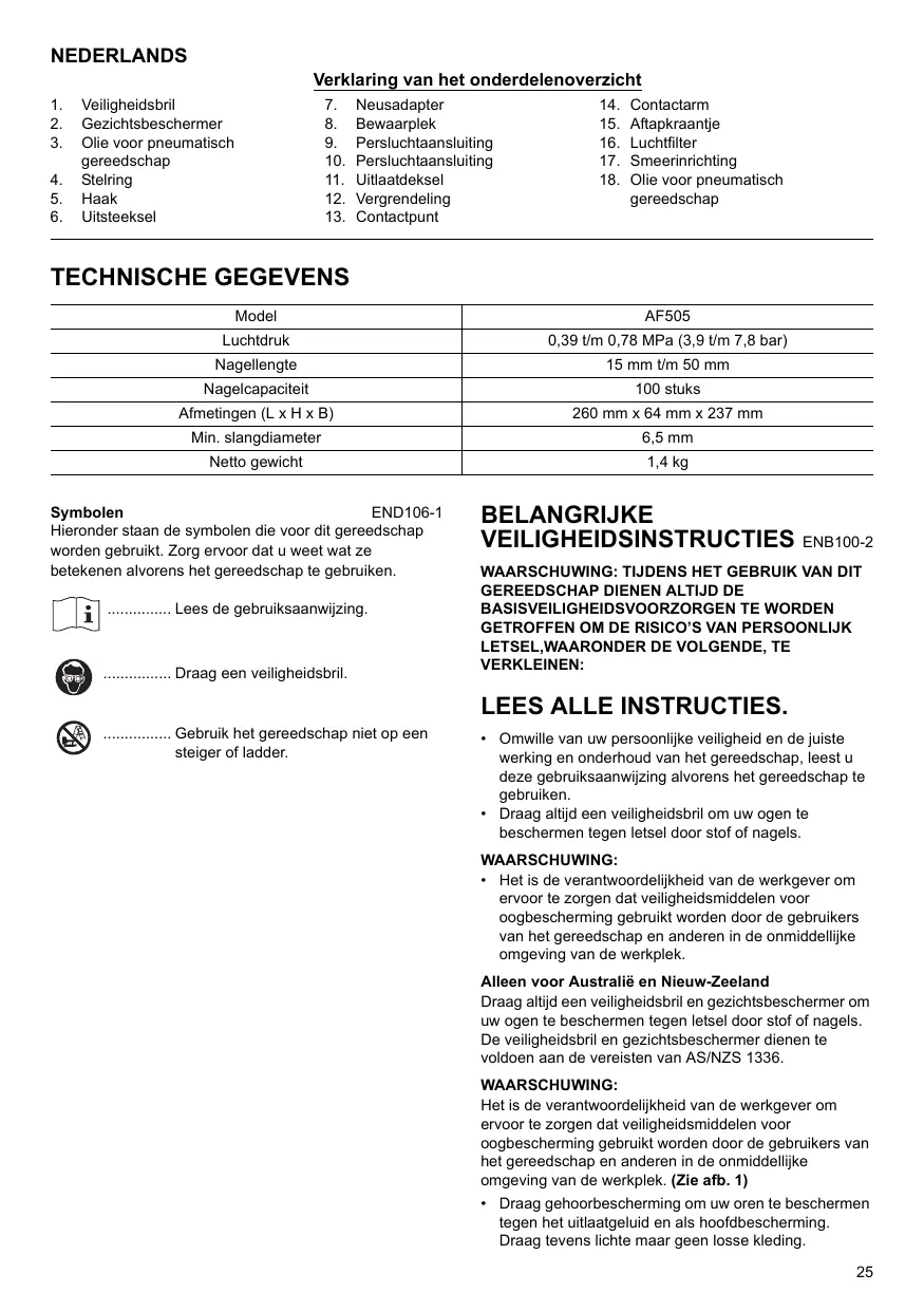 Draag altiijd een veiligheidsbril en gezichtsbeschermer om uw ogen te beschemten gegen letseit door stof of nagels. De veiligheidsbril en gezichtsbeschermer dieren te voldoen aan de vereisten van AS/NZS 1336.
