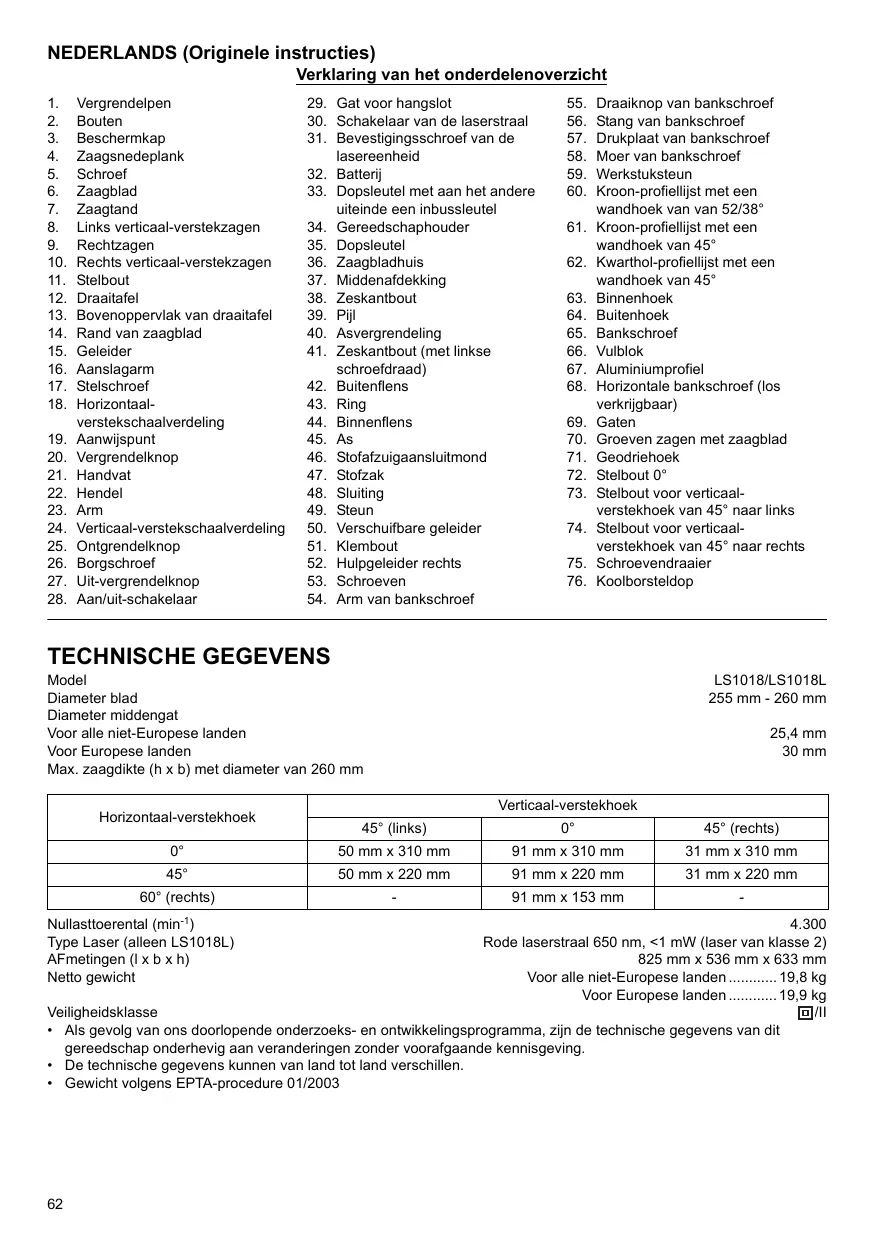 1. Vergrendelpen 29. Gat voor hangslot 55. Draaïknop van bankschroef 2. Bouten 30. Schakelaar van de laserstraal 56. Stang van bankschroef 3. Beschermkap 31. Bevestigingsschroef van de 57. Drukplaat van bankschroef 4. Zaagsnedeplank lasereenheid 58. Moer van bankschroef 5. Schroef 32. Batteri 59. Werkstuksteun 6. Zaagblad 33. Dopsleutel met aan het andere 60. Kroon-profiellist met een 7. Zaagtand uiteinde een inbussleutel wandhoek van van 52/38° 8. Links verticaal-verstekzagen 34. Gereedschaphouder 61. Kroon-profiellijst met een 9. Rechtzagen 35. Dopsleutel wandhoek van 45° 10. Rechis verticaal-verstekzagen 36. Zaagbladhuis 62. Kwarthol-profelljst met een 11. Stelbout 37. Middenafdekking wandhoek van 45° 12. Draaitafel 38. Zeskantbout 63. Binnenhoek 13. Bovenopperviak van draaitafel 39. Pijl 64. Buitenhoek 14. Rand van zaagblad 40. Asvergrendeling 65. Bankschroef 15. Geleider 41. Zeskantbout (met Iinkse 66. Vulblok 16. Aanslagarm schroefdraad) 67. Aluminiumprofiel 17. Stelschroef 42. Buitenflens 68. Horizontale bankschroef (los 18. Horizontaal- 43. Ring verkrijgbaar) verstekschaalverdeling 44. Binnenflens 69. Gaten 19. Aanwijspunt 45. As 70. Groeven zagen met zaagblad 20. Vergrendelknop 46. Stofafzuigaansluitmond 71. Geodriehoek 21. Handvat 47. Slofzak 72. Stelbout 0° 22. Hendel 48. Sluiting 73. Stelbout voor verticaal- 23. Arm 49. Steun verstekhoek van 45° naar links 24. Verticaal-verstekschaalverdeling 50. Verschuifbare geleider 74. Stelbout voor verticaal- 25. Ontgrendelknop 51. Klembout verstekhoek van 45° naar rechts 26. Borgschroef 52. Hulpgeleider rechts 75. Schroevendraaier 27. Uit-vergrendelknop 53. Schroeven 76. Koolborsteldop 28. Aan/uit-schakelaar 54. Arm van bankschroef TECHNISCHE GEGEVENS Model LS1018/LS1018L Diameter blad 255 mm - 260 mm Diameter middengat Voor alle niet-Europese landen 25,4 mm Voor Europese landen 30 mm Max. zaagdikte (h x b) met diameter van 260 mm Verticaal-verstekhoek Horizontaal-verstekhoek 45° (links) 0° 45° (rechts) 0° 50 mm x 310 mm 91 mm x 310 mm 31 mm x 310 mm 45° 50 mm x 220 mm 91 mm x 220 mm 31 mm x 220 mm 60° (rechts) = 91 mm x 153 mm = Nullasttoerental (min!) 4.300 Type Laser (alleen LS1018L) Rode laserstraal 650 nm, <1 mW (laser van klasse 2) AFmetingen (1 x b x h) 825 mm x 536 mm x 633 mm Netto gewicht Voor alle niet-Europese landen 19,8 kg