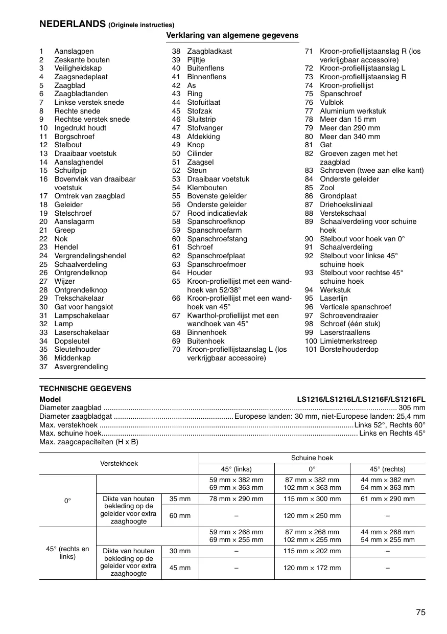 Diameter zaagblad Diameter zaagbladgat Max. verstekhoek Max. schuine hoëk. . Max. zaagcapaciteiten (H x B)