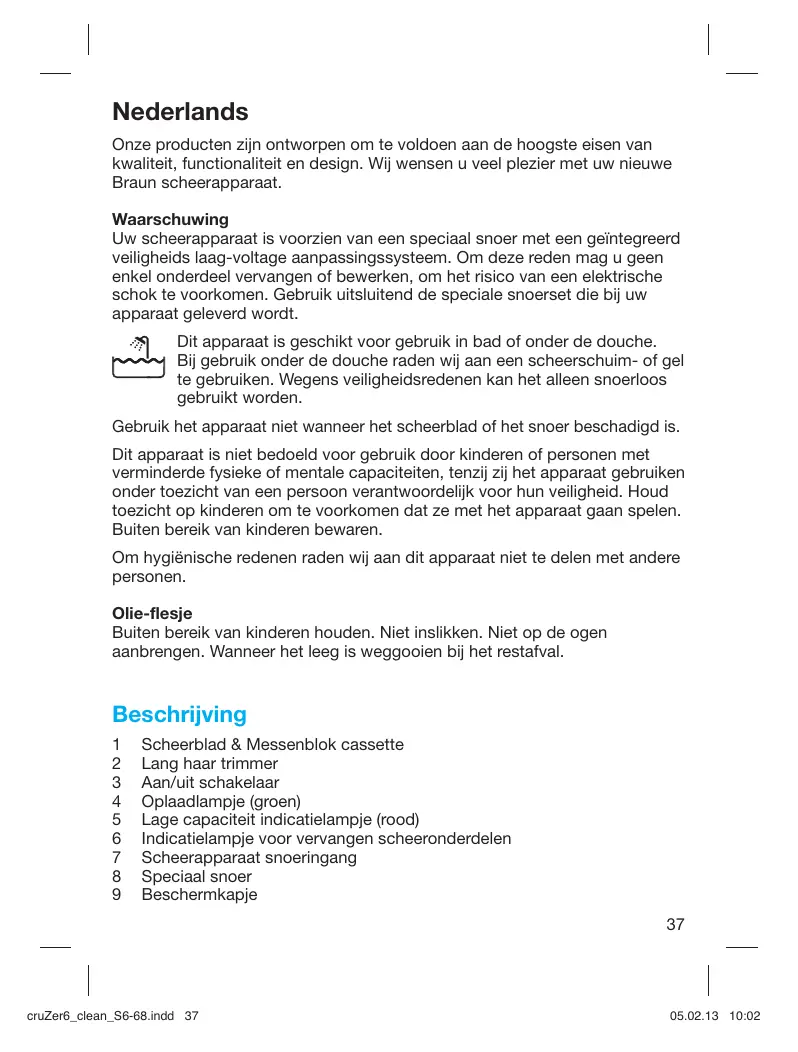 Nederlands Onze producten zijn ontworpen om te voldoen aan de hoogste eisen van kwaliteit, functionaliteit en design. Wij wensen u veel plezier met uw nieuwe Braun scheerapparaat. Waarschuwing Uw scheerapparaat is voorzien van een speciaal snoer met een geïntegreerd veiligheids laag-voltage aanpassingssysteem. Om deze reden mag u geen enkel onderdeel vervangen of bewerken, om het risico van een elektrische schok te voorkomen. Gebruik uitsluitend de speciale snoerset die bij uw apparaat geleverd wordt. Dit apparaat is geschikt voor gebruik in bad of onder de douche. Bij gebruik onder de douche raden wij aan een scheerschuim- of gel te gebruiken. Wegens veiligheidsredenen kan het alleen snoerloos gebruikt worden. Gebruik het apparaat niet wanneer het scheerblad of het snoer beschadigd is. Dit apparaat is niet bedoeld voor gebruik door kinderen of personen met verminderde fysieke of mentale capaciteiten, tenzij zij het apparaat gebruiken onder toezicht van een persoon verantwoordelijk voor hun veiligheid. Houd toezicht op kinderen om te voorkomen dat ze met het apparaat gaan spelen. Buiten bereik van kinderen bewaren. Om hygiënische redenen raden wij aan dit apparaat niet te delen met andere personen. Olie-flesje Buiten bereik van kinderen houden. Niet inslikken. Niet op de ogen aanbrengen. Wanneer het leeg is weggooien bij het restafval. Beschrijving