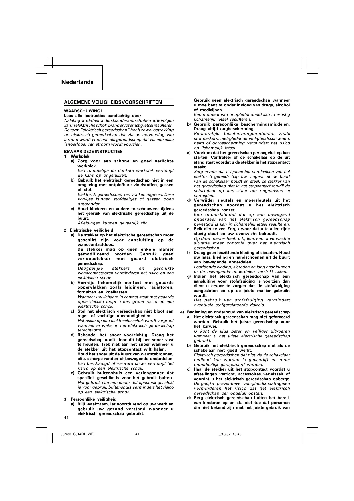 5/16/07, 15:40 Nederlands ALGEMENE VEILIGHEIDSVOORSCHRIFTEN WAARSCHUWING! Lees alle instructies aandachtig door Nalating om de hieronderstaande voorschriften op te volgen kan in elektrische schok, brand en/of ernstig letsel resulteren. De term “elektrisch gereedschap” heeft zowel betrekking op elektrisch gereedschap dat via de netvoeding van stroom wordt voorzien als gereedschap dat via een accu (snoerloos) van stroom wordt voorzien.