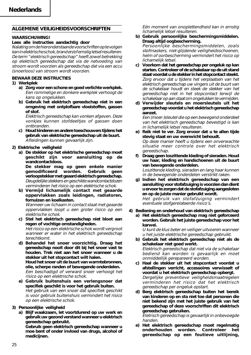 Nederlands ALGEMENE VEILIGHEIDSVOORSCHRIFTEN WAARSCHUWING! Lees alle instructies aandachtig door Nalating om de hieronderstaande voorschriften op te volgen kan in elektrische schok, brand en/of ernstig letsel resulteren. De term “elektrisch gereedschap” heeft zowel betrekking op elektrisch gereedschap dat via de netvoeding van stroom wordt voorzien als gereedschap dat via een accu (snoerloos) van stroom wordt voorzien.