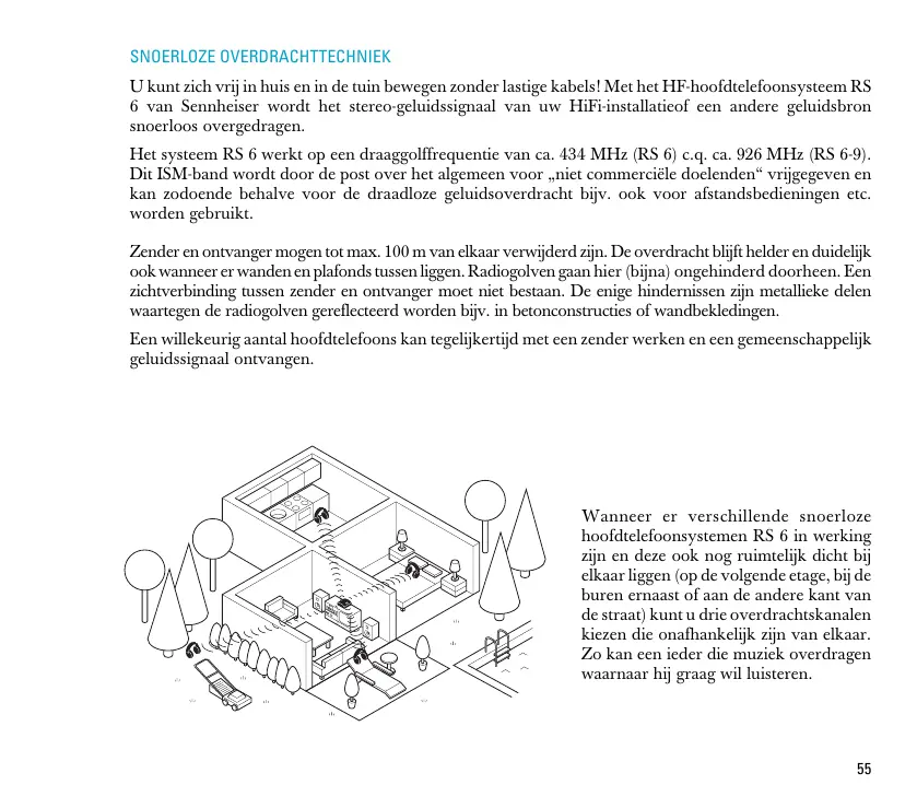 SNOERLOZE OVERDRACHTTECHNIEK U kunt zich vrij in huis en in de tuin bewegen zonder lastige kabels! Met het HF-hoofdtelefoonsysteem RS 6 van Sennheiser wordt het stereo-geluidssignaal van uw HiFi-installatieof een andere geluidsbron snoerloos overgedragen. Het systeem RS 6 werkt op een draaggolffrequentie van ca. 434 MHz (RS 6) c.q. ca. 926 MHz (RS 6-9). Dit ISM-band wordt door de post over het algemeen voor „niet commerciële doelenden“ vrijgegeven en kan zodoende behalve voor de draadloze geluidsoverdracht bijv. ook voor afstandsbedieningen etc. worden gebruikt. Zender en ontvanger mogen tot max. 100 m van elkaar verwijderd zijn. De overdracht blijft helder en duidelijk ook wanneer er wanden en plafonds tussen liggen. Radiogolven gaan hier (bijna) ongehinderd doorheen. Een zichtverbinding tussen zender en ontvanger moet niet bestaan. De enige hindernissen zijn metallieke delen waartegen de radiogolven gereflecteerd worden bijv. in betonconstructies of wandbekledingen. Een willekeurig aantal hoofdtelefoons kan tegelijkertijd met een zender werken en een gemeenschappelijk geluidssignaal ontvangen. Wanneer er verschillende snoerloze hoofdtelefoonsystemen RS 6 in werking zijn en deze ook nog ruimtelijk dicht bij elkaar liggen (op de volgende etage, bij de buren ernaast of aan de andere kant van de straat) kunt u drie overdrachtskanalen kiezen die onafhankelijk zijn van elkaar. Zo kan een ieder die muziek overdragen waarnaar hij graag wil luisteren.