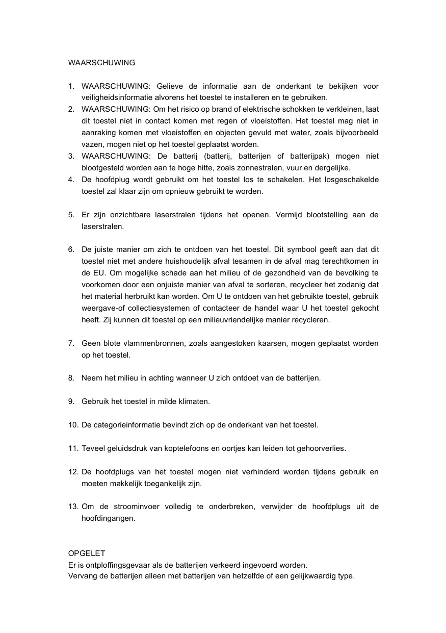hoofdingangen. OPGELET Er is ontploffingsgevaar als de batterijen verkeerd ingevoerd worden. Vervang de batterijen alleen met batterijen van hetzelfde of een gelijkwaardig type. WAARSCHUWING OM BRAND OF GEVAAR VOOR ELEKTRISCHE SCHOKKEN TE VOORKOMEN, MAG U DIT TOESTEL NIET BLOOTSTELLEN AAN REGEN OF VOCHT. BLIKSEMSCHICHT MET PIJLPUNT - in een gelijkzijdige driehoek, is bedoeld om de gebruiker te wijzen op de aanwezigheid van niet geïsoleerde gevaarlijke spanning binnen in het product, die voldoende sterk kan zijn om een gevaar voor elektrische schok te vormen voor mensen. UITROEPTEKEN - in een gelijkzijdige driehoek, wordt gebruikt om aan te geven dat een specifiek onderdeel om veiligheidsredenen enkel mag worden vervangen door het onderdeel dat wordt beschreven in de documentatie. Het volgende etiket werd aangebracht op het toestel en geeft de juiste procedure weer om te werken met de lasterstraal: KLASSE 1 LASERPRODUCT ETIKET Dit etiket werd aangebracht zoals op de afbeelding om mee te delen dat het toestel een laseronderdeel bevat. VEILIGHEIDS INSTRUCTIES WAARSCHUWING ETIKET DAT WIJST OP STRALING Dit etiket werd aan de binnenkant van het toestel aangebracht. Zoals weergegeven in de illustratie. Om te waarschuwen tegen verdere handelingen aan het toestel. De uitrusting bevat een laser die lasterstralen uitzendt binnen de grenzen van laserproducten van klasse 1. NL-1 VEILIGHEIDSINSTRUCTIES