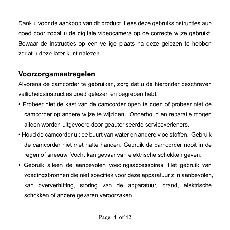 Page 3 of 42 Dank u voor de aankoop van dit product. Lees deze gebruiksinstructies aub goed door zodat u de digitale videocamera op de correcte wijze gebruikt. Bewaar de instructies op een veilige plaats na deze gelezen te hebben zodat u deze later kunt nalezen. Voorzorgsmaatregelen Alvorens de camcorder te gebruiken, zorg dat u de hieronder beschreven veiligheidsinstructies goed gelezen en begrepen hebt.