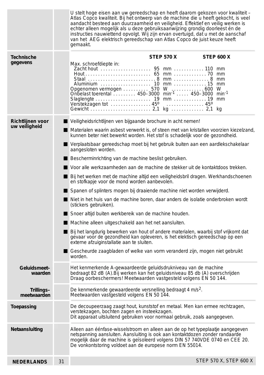 - U stelt hoge eisen aan uw gereedschap en heeft daarom gekozen voor kwaliteit – Atlas Copco kwaliteit. Bij het ontwerp van de machine die u heeft gekocht, is veel aandacht besteed aan duurzaamheid en veiligheid. Effektief en veilig werken is echter alleen mogelijk als u deze gebruiksaanwijzing grondig doorleest én de instructies nauwiettend opvolgt. Wij zijn ervan overtuigd, dat u met de aanschaf van het AEG elektrisch gereedschap van Atlas Copco de juist keuze heeft gemaakt. STEP 570 X STEP 600 X Max. schroefdiepte in: Zacht hout p. 95