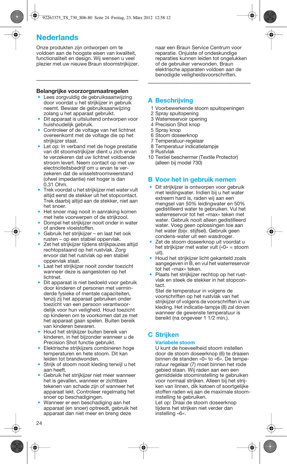 92263375_TS_730_S06-80 Seite 24 Freitag, 23. März 2012 12:58 12 Nederlands Onze produkten zijn ontworpen om te voldoen aan de hoogste eisen van kwaliteit, functionaliteit en design. Wij wensen u veel plezier met uw nieuwe Braun stoomstrijkijzer.
