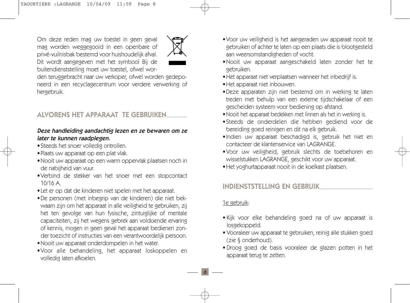 YAOURTIERE : LAGRANGE 10/04/09 11:59 Page 8 Om deze reden mag uw toestel in geen geval mag worden weggegooid in een openbare of privé-vuilnisoak bestemd voor huishoudelijk afval. Dit wordt aangegeven met het symbool Bij de LT buitendienststelling moet uw toestel, ofwel wor- den teruggebracht naar uw verkoper, ofwel worden gedepo- neerd in een recyclagecentrum voor verdere verwerking of hergebruik.