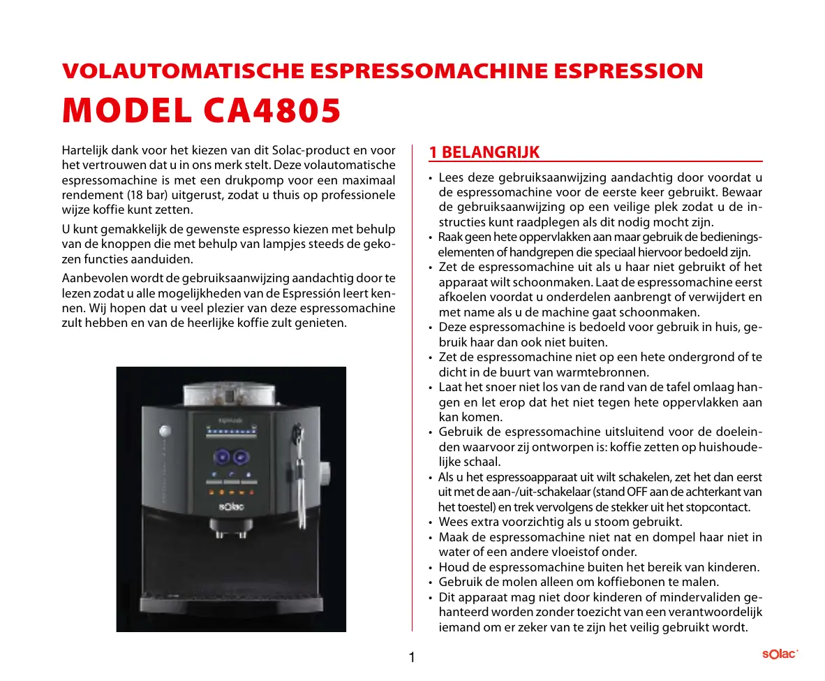 MODEL CA4805 Hartelijk dank voor het kiezen van dit Solac-product en voor het vertrouwen dat u in ons merk stelt. Deze volautomatische espressomachine is met een drukpomp voor een maximaal rendement (18 bar) uitgerust, zodat u thuis op professionele wijze koffie kunt zetten. U kunt gemakkelijk de gewenste espresso kiezen met behulp van de knoppen die met behulp van lampjes steeds de gekozen functies aanduiden. Aanbevolen wordt de gebruiksaanwijzing aandachtig door te lezen zodat u alle mogelijkheden van de Espressión leert kennen. Wij hopen dat u veel plezier van deze espressomachine zult hebben en van de heerlijke koffie zult genieten. 1 BELANGRIJK