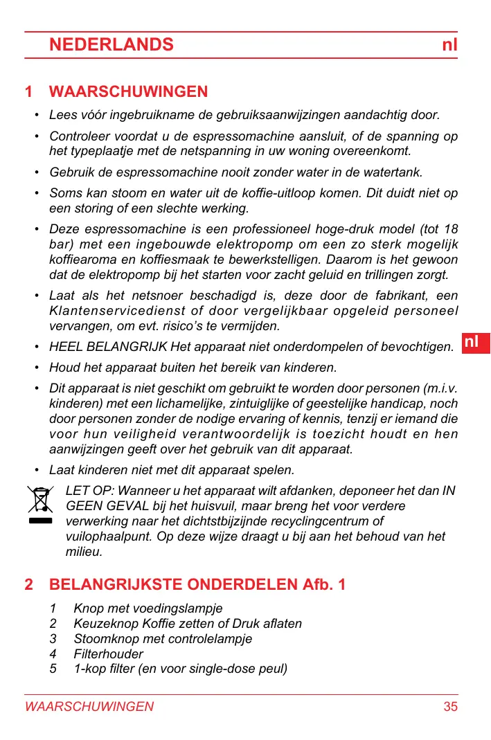 GEEN GEVAL bi het huisvuil, maar breng het voor verdere verwerking naar het dichtstbijzijnde recyclingcentrum of vuilophaalpunt. Op deze wijze draagt u bij aan het behoud van het milieu. 2 BELANGRUKSTE ONDERDELEN Afb. 1 Knop met voedingslampje Keuzeknop Koffie zetten of Druk aflaten Stoomknop met controlelampje Filterhouder 1-kop filter (en voor single-dose peul) CENTER WAARSCHUWINGEN 35