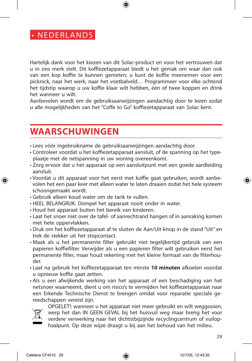 - NEDERL AND S Hartelijk dank voor het kiezen van dit Solac-product en voor het vertrouwen dat u in ons merk stelt. Dit koffiezetapparaat biedt u het gemak om waar dan ook van een kop koffie te kunnen genieten; u kunt de koffie meenemen voor een picknick, naar het werk, naar het voetbalveld… Programmeer voor elke ochtend het tijdstip waarop u uw koffie klaar wilt hebben, één of twee koppen en drink het wanneer u wilt. Aanbevolen wordt om de gebruiksaanwijzingen aandachtig door te lezen zodat u alle mogelijkheden van het “Coffe to Go” koffiezetapparaat van Solac kent. WAARSCHUWINGEN