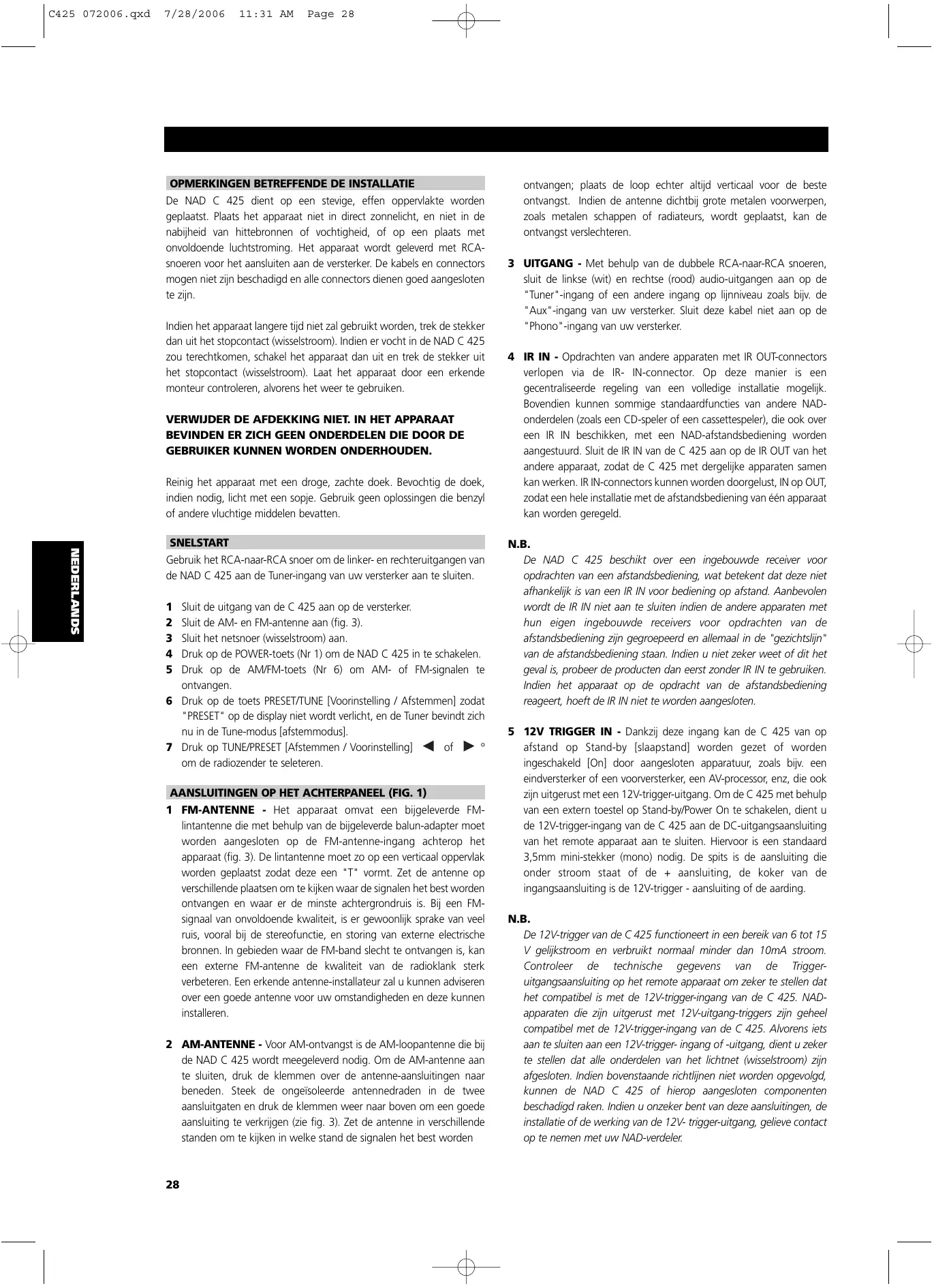 ontvangen; plaats de loop echter altijd verticaal voor de beste ontvangst. Indien de antenne dichtbij grote metalen voorwerpen, zoals metalen schappen of radiateurs, wordt geplaatst, kan de ontvangst verslechteren. 3 UITGANG - Met behulp van de dubbele RCA-naar-RCA snoeren, sluit de linkse (wit) en rechtse (rood) audio-uitgangen aan op de "Tuner"-ingang of een andere ingang op lijnniveau zoals bijv. de "Aux"-ingang van uw versterker. Sluit deze kabel niet aan op de "Phono"-ingang van uw versterker. 4 IR IN - Opdrachten van andere apparaten met IR OUT-connectors verlopen via de IR- IN-connector. Op deze manier is een gecentraliseerde regeling van een volledige installatie mogelijk. Bovendien kunnen sommige standaardfuncties van andere NADonderdelen (zoals een CD-speler of een cassettespeler), die ook over een IR IN beschikken, met een NAD-afstandsbediening worden aangestuurd. Sluit de IR IN van de C 425 aan op de IR OUT van het andere apparaat, zodat de C 425 met dergelijke apparaten samen kan werken. IR IN-connectors kunnen worden doorgelust, IN op OUT, zodat een hele installatie met de afstandsbediening van één apparaat kan worden geregeld. N.B. De NAD C 425 beschikt over een ingebouwde receiver voor opdrachten van een afstandsbediening, wat betekent dat deze niet afhankelijk is van een IR IN voor bediening op afstand. Aanbevolen wordt de IR IN niet aan te sluiten indien de andere apparaten met hun eigen ingebouwde receivers voor opdrachten van de afstandsbediening zijn gegroepeerd en allemaal in de "gezichtslijn" van de afstandsbediening staan. Indien u niet zeker weet of dit het geval is, probeer de producten dan eerst zonder IR IN te gebruiken. Indien het apparaat op de opdracht van de afstandsbediening reageert, hoeft de IR IN niet te worden aangesloten. 5 12V TRIGGER IN - Dankzij deze ingang kan de C 425 van op afstand op Stand-by [slaapstand] worden gezet of worden ingeschakeld [On] door aangesloten apparatuur, zoals bijv. een eindversterker of een voorversterker, een AV-processor, enz, die ook zijn uitgerust met een 12V-trigger-uitgang. Om de C 425 met behulp van een extern toestel op Stand-by/Power On te schakelen, dient u de 12V-trigger-ingang van de C 425 aan de DC-uitgangsaansluiting van het remote apparaat aan te sluiten. Hiervoor is een standaard 3,5mm mini-stekker (mono) nodig. De spits is de aansluiting die onder stroom staat of de + aansluiting, de koker van de ingangsaansluiting is de 12V-trigger - aansluiting of de aarding. N.B. De 12V-trigger van de C 425 functioneert in een bereik van 6 tot 15 V gelijkstroom en verbruikt normaal minder dan 10mA stroom. Controleer de technische gegevens van de Triggeruitgangsaansluiting op het remote apparaat om zeker te stellen dat het compatibel is met de 12V-trigger-ingang van de C 425. NADapparaten die zijn uitgerust met 12V-uitgang-triggers zijn geheel compatibel met de 12V-trigger-ingang van de C 425. Alvorens iets aan te sluiten aan een 12V-trigger- ingang of -uitgang, dient u zeker te stellen dat alle onderdelen van het lichtnet (wisselstroom) zijn afgesloten. Indien bovenstaande richtlijnen niet worden opgevolgd, kunnen de NAD C 425 of hierop aangesloten componenten beschadigd raken. Indien u onzeker bent van deze aansluitingen, de installatie of de werking van de 12V- trigger-uitgang, gelieve contact op te nemen met uw NAD-verdeler. Page 29 N.B. De C 425 omvat een ingebouwde receiver om opdrachten te ontvangen van een afstandsbediening. De meeste NADafstandsbedieningen die over een aan- / uit-toets beschikken of over twee verschillende toetsen voor het in- en uitschakelen kunnen de tuner normaal gezien vanuit Stand-by [slaapstand] inschakelen en omgekeerd. De C 425 beschikt over een back-up-geheugen om de Presetgegevens [voorinstellingen] op te slaan. Deze informatie blijft meerdere weken in het geheugen opgeslagen, zelfs wanneer het apparaat volledig is uitgeschakeld of wanneer de stekker is uitgetrokken. Wanneer het apparaat wordt ingeschakeld, schakelt de C 425 terug naar de laatste radiozender die was ingesteld voordat het apparaat werd uitgeschakeld. Zo kan u de tijd van opnames instellen met behulp van een externe timer en opnemer. 2 POWER-CONTROLELAMP - De groene Power-controlelamp gaat aan wanneer het apparaat wordt ingeschakeld. Wanneer de tuner in Stand-by-modus staat (op slaapstand geschakeld d.m.v. een afstandsbediening of de 12V-trigger-ingang) wordt de controlelamp oranje. Wanneer het apparaat volledig is uitgeschakeld, gaat deze controlelamp uit. 3 BLEND [Mengen] (TNR 1 fig. 3) - De signalen van zwakke of verre stereo-radiozenders worden soms ontvangen met ruis of met een fluitend geluid daar de signalen te zwak zijn. Door de tuner op mono in te stellen kan u deze ruis of dit fluitend geluid verminderen maar dit heeft wel als gevolg dat u de stereo-signalen verliest. De BLEND-functie [Mengen] van NAD biedt u de mogelijkheid deze ruis en dit fluitend geluid te verminderen en, in tegenstelling met mono, tegelijkertijd een zekere hoeveelheid van de stereo-afscheiding te behouden. De Blend-toets schakelt de mengfunctie in en uit, en wanneer BLEND is ingeschakeld, gaat de "BLEND"-controlelamp aan op de display. N.B. U kan de "Blend"-stand voor de verschillende vooringestelde radiozenders opslaan. Voor nadere informatie, gelieve het Hoofdstuk "Opslaan, oproepen en het benamen van voorinstellingen" te raadplegen. 4 MEMORY [Geheugen] - Het geheugen dient om de verschillende vooringestelde radiozenders op te slaan en om de namen, die u aan vooringestelde radiozenders zonder RDS informatie heeft toegewezen, op te slaan. Wanneer u bij normaal gebruik op Memory drukt, knippert het nummer van de Preset [voorinstelling] en de rode "MEMORY"-controlelamp op de display. Indien er in minder dan 12 seconden geen andere toets wordt ingedrukt, schakelt de tuner Bij normaal gebruik, is het dempcircuit ingeschakeld, en de display geeft "FM MUTE" weer. Druk op de FM Mute/Mode-toets om het dempcircuit uit te schakelen en om van ster