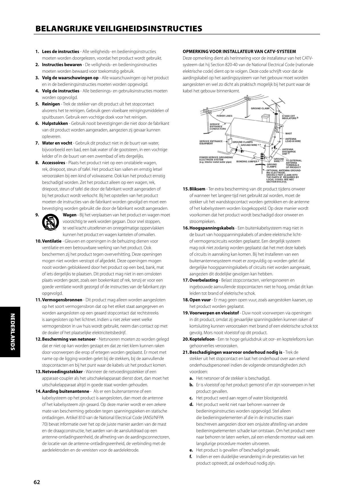 3. Tenez compte des Avertissements - Tous les Avertissements imprimés sur le produit et figurant dans les instructions d’utilisation doivent être respectés. 4. Suivez les instructions - Toutes les instructions d’utilisation et de fonctionnement doivent être suivies. 5. Nettoyage - Débranchez ce produit de la prise murale avant de procéder à son nettoyage. N’utilisez aucun nettoyant liquide ou aérosol. Servez-vous d’un chiffon humide pour effectuer le nettoyage. 6. Fixations - N’utilisez pas de fixations non recommandées par le fabricant car elles pourraient présenter des risques pour la sécurité. 7. Eau et humidité - N’utilisez pas ce produit près de l’eau, par exemple près d’une baignoire, d’un lavabo, d’un évier ou d’un bac à lessive. Ne l’utilisez pas non plus dans une cave humide, près d’une piscine ou dans un endroit semblable. 8. Accessoires - Ne mettez jamais cet appareil sur un chariot, un support, un trépied, une console ou une table instables. L’appareil risquerait de tomber, provoquant des blessures graves chez un enfant ou un adulte et pourrait lui-même subir de sérieux dommages. Utilisez exclusivement un chariot, un support, un trépied, une console ou une table préconisés par le fabricant ou vendus avec l’appareil. Toute fixation du produit doit être réalisée conformément aux instructions du fabricant, et à l’aide d’un accessoire de fixation préconisé par le fabricant. 9. Chariot - Lorsque l’appareil est sur un chariot mobile, il doit être déplacé avec précaution. Les arrêts brusques, les efforts excessifs et les sols accidentés risquent de renverser le chariot et l’appareil. 10. Ventilation - Le boîtier comporte des fentes et des ouvertures permettant l’aération et le fonctionnement fiable de l’appareil et l’empêchant de chauffer excessivement. Ces ouvertures ne doivent jamais être obstruées ou recouvertes. Les fentes ne doivent jamais être obstruées en posant l’appareil sur un lit, un canapé, un tapis ou toute autre surface molle similaire. Ce produit ne doit pas être placé dans un ensemble encastré, comme par exemple une bibliothèque vitrée ou un rack, à moins de prévoir une ventilation adéquate ou de respecter les instructions du fabricant. 11. Sources d’alimentation - Ce produit doit obligatoirement être alimenté par une source du type indiqué sur l’étiquette et connecté à une prise de terre SECTEUR. Si vous avez un doute concernant le type d’alimentation secteur utilisé à votre domicile, consultez votre revendeur ou le fournisseur local d’électricité. 12. Protection du câble d’alimentation - Les câbles d’alimentation ne doivent pas passer dans des endroits où ils risquent d’être piétinés ou pincés par des articles posés dessus ou à côté. Faites particulièrement attention aux câbles au niveau des prises, des connecteurs de commodité à l’arrière d’autres appareils, et à leur point de sortie de cet appareil. 13. Prise Secteur - Si une prise secteur ou coupleur d’appareils est utilisé(e) comme dispositif de débranchement, ce dispositif de débranchement doit être facilement accessible. 14. Mise à la terre d’une Antenne Extérieure - Si l’appareil est relié à une antenne extérieure ou à un réseau de câbles extérieurs, veillez à ce que l’antenne ou le réseau de câbles soit mis à la terre afin d’assurer la même protection contre les pics de tension et les charges liées à l’accumulation d’électricité statique. L’Article 810 du National Electrical Code (NEC), ANSI/NFPA 70, contient des informations concernant la mise à la terre correcte du mât et de la structure porteuse, la mise à la terre du câble d’amenée sur un dispositif de décharge d’antenne, le calibre des câbles de mise à la terre, l’emplacement du dispositif de décharge d’antenne, le branchement aux électrodes de mise à la terre et les exigences concernant les électrodes de mise à la terre.
