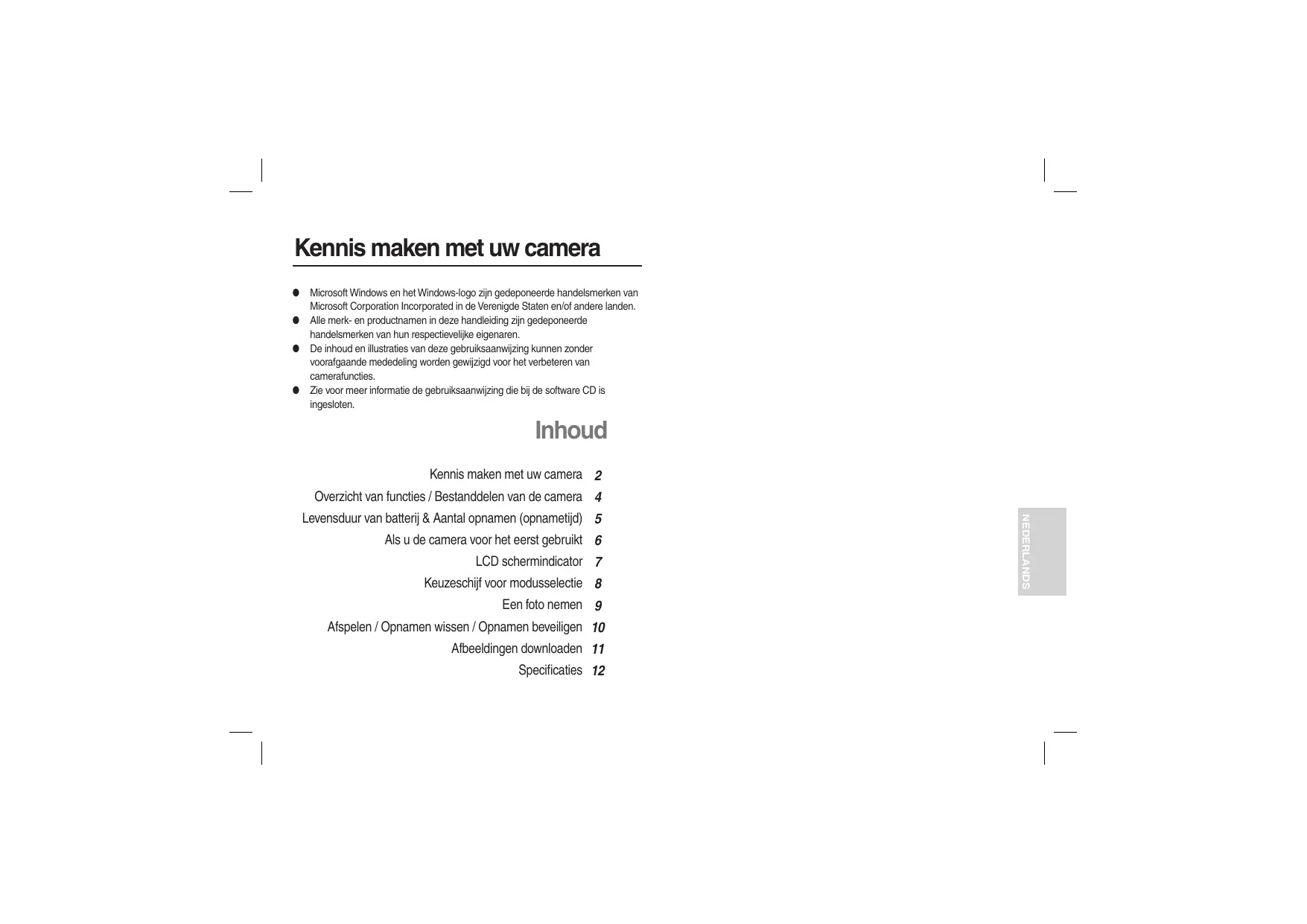 Kennis maken met uw camera © _ Microsoft Windows en het Windows-logo ziin gedeponeerde handelsmerken van Microsoft Corporation Incorporated in de Verenigde Staten en/of andere landen. Alle merkc en productnamen in deze handleiding zijn gedeponeerde handelsmerken van hun respectievelike eigenaren. © De inhoud en ilustrties van deze gebruiksaanwizing kunnen zonder voorafgaande mededeling worden gewijzigd voor het verbeteren van camerafuncties. © Zie voor meer informatie de gebruiksaanwizing die bij de software CD is ingesloten. Inhoud Kennis maken met uw camera 2 Overzicht van functies / Bestanddelen van de camera 4 Levensduur van batteri & Aantal opnamen (opnametid) 5 Als u de camera voor het eerst gebruikt 6 LCD schermindicator 7 Keuzeschijf voor modusselectie 8 Een fotonemen g Afspelen / Opnamen wissen / Opnamen beveiligen 10 Aïbeeldingen dounloaden 11 Specificaties 12