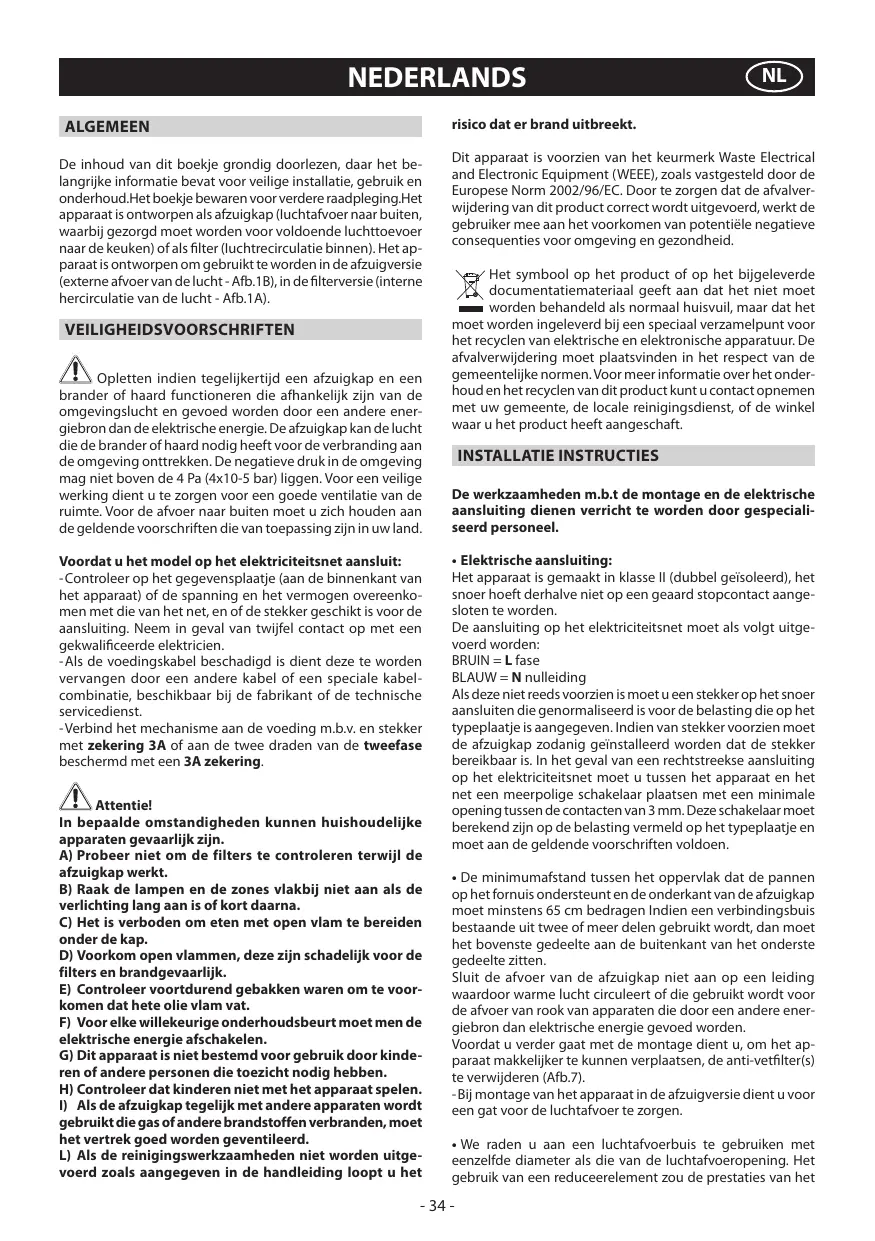 As deze niet reeds voorzien is moetu een stekker op het snoer aansluiten die genormaliseerd is voor de belasting die op het typeplaatje is aangegeven. Indien van stekker voorzien moet de afzuigkap zodanig geinstalleerd worden dat de stekker bereikbaar is. In het geval van een rechtstreekse aansluiting op het elektriciteitsnet moet u tussen het apparaat en het net een meerpolige schakelaar plaatsen met een minimale opening tussen de contacten van 3 mm. Deze schakelaar moet berekend zijn op de belasting vermeld op het typeplaatje en moet aan de geldende voorschriften voldoen.