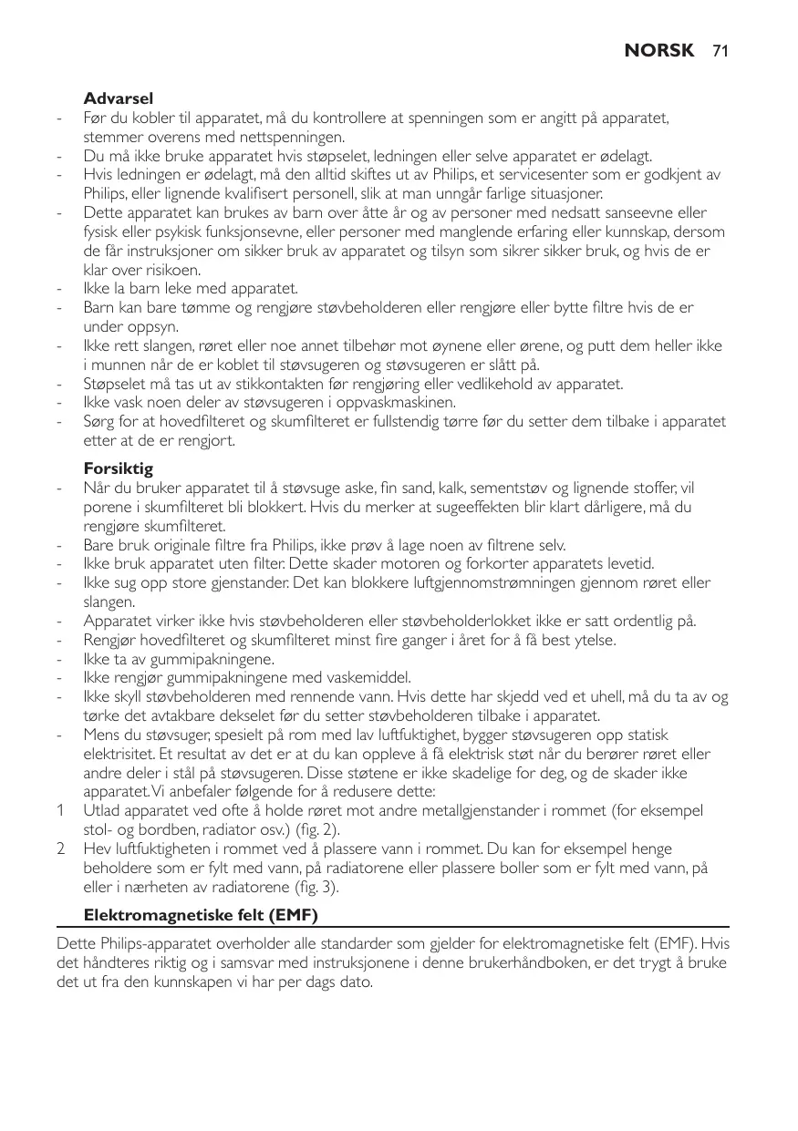 Norsk 71 Advarsel -- Før du kobler til apparatet, må du kontrollere at spenningen som er angitt på apparatet, stemmer overens med nettspenningen. -- Du må ikke bruke apparatet hvis støpselet, ledningen eller selve apparatet er ødelagt. -- Hvis ledningen er ødelagt, må den alltid skiftes ut av Philips, et servicesenter som er godkjent av Philips, eller lignende kvalifisert personell, slik at man unngår farlige situasjoner. -- Dette apparatet kan brukes av barn over åtte år og av personer med nedsatt sanseevne eller fysisk eller psykisk funksjonsevne, eller personer med manglende erfaring eller kunnskap, dersom de får instruksjoner om sikker bruk av apparatet og tilsyn som sikrer sikker bruk, og hvis de er klar over risikoen. -- Ikke la barn leke med apparatet. -- Barn kan bare tømme og rengjøre støvbeholderen eller rengjøre eller bytte filtre hvis de er under oppsyn. -- Ikke rett slangen, røret eller noe annet tilbehør mot øynene eller ørene, og putt dem heller ikke i munnen når de er koblet til støvsugeren og støvsugeren er slått på. -- Støpselet må tas ut av stikkontakten før rengjøring eller vedlikehold av apparatet. -- Ikke vask noen deler av støvsugeren i oppvaskmaskinen. -- Sørg for at hovedfilteret og skumfilteret er fullstendig tørre før du setter dem tilbake i apparatet etter at de er rengjort. Forsiktig -- Når du bruker apparatet til å støvsuge aske, fin sand, kalk, sementstøv og lignende stoffer, vil porene i skumfilteret bli blokkert. Hvis du merker at sugeeffekten blir klart dårligere, må du rengjøre skumfilteret. -- Bare bruk originale filtre fra Philips, ikke prøv å lage noen av filtrene selv. -- Ikke bruk apparatet uten filter. Dette skader motoren og forkorter apparatets levetid. -- Ikke sug opp store gjenstander. Det kan blokkere luftgjennomstrømningen gjennom røret eller slangen. -- Apparatet virker ikke hvis støvbeholderen eller støvbeholderlokket ikke er satt ordentlig på. -- Rengjør hovedfilteret og skumfilteret minst fire ganger i året for å få best ytelse. -- Ikke ta av gummipakningene. -- Ikke rengjør gummipakningene med vaskemiddel. -- Ikke skyll støvbeholderen med rennende vann. Hvis dette har skjedd ved et uhell, må du ta av og tørke det avtakbare dekselet før du setter støvbeholderen tilbake i apparatet. -- Mens du støvsuger, spesielt på rom med lav luftfuktighet, bygger støvsugeren opp statisk elektrisitet. Et resultat av det er at du kan oppleve å få elektrisk støt når du berører røret eller andre deler i stål på støvsugeren. Disse støtene er ikke skadelige for deg, og de skader ikke apparatet. Vi anbefaler følgende for å redusere dette: 1 Utlad apparatet ved ofte å holde røret mot andre metallgjenstander i rommet (for eksempel stol- og bordben, radiator osv.) (fig. 2). 2 Hev luftfuktigheten i rommet ved å plassere vann i rommet. Du kan for eksempel henge beholdere som er fylt med vann, på radiatorene eller plassere boller som er fylt med vann, på eller i nærheten av radiatorene (fig. 3). Elektromagnetiske felt (EMF) Dette Philips-apparatet overholder alle standarder som gjelder for elektromagnetiske felt (EMF). Hvis det håndteres riktig og i samsvar med instruksjonene i denne brukerhåndboken, er det trygt å bruke det ut fra den kunnskapen vi har per dags dato.