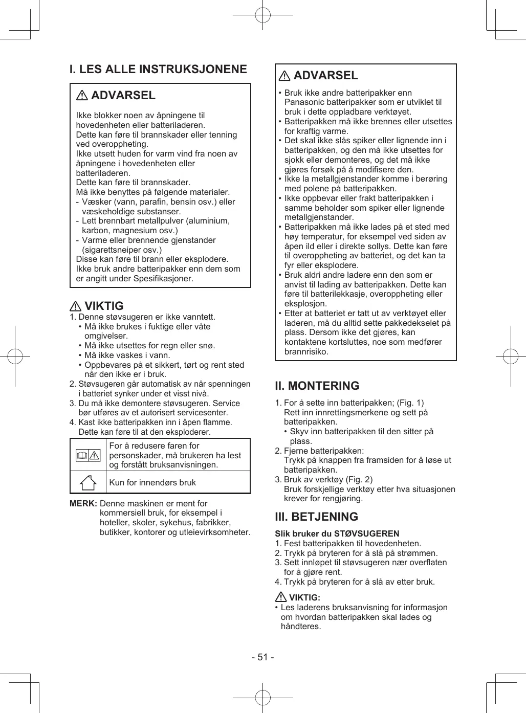 I. LES ALLE INSTRUKSJONENE ADVARSEL • Bruk ikke andre batteripakker enn Panasonic batteripakker som er utviklet til bruk i dette oppladbare verktøyet. • Batteripakken må ikke brennes eller utsettes for kraftig varme. • Det skal ikke slås spiker eller lignende inn i batteripakken, og den må ikke utsettes for sjokk eller demonteres, og det må ikke gjøres forsøk på å modifisere den. • Ikke la metallgjenstander komme i berøring med polene på batteripakken. • Ikke oppbevar eller frakt batteripakken i samme beholder som spiker eller lignende metallgjenstander. • Batteripakken må ikke lades på et sted med høy temperatur, for eksempel ved siden av åpen ild eller i direkte sollys. Dette kan føre til overoppheting av batteriet, og det kan ta fyr eller eksplodere. • Bruk aldri andre ladere enn den som er anvist til lading av batteripakken. Dette kan føre til batterilekkasje, overoppheting eller eksplosjon. • Etter at batteriet er tatt ut av verktøyet eller laderen, må du alltid sette pakkedekselet på plass. Dersom ikke det gjøres, kan kontaktene kortsluttes, noe som medfører brannrisiko.