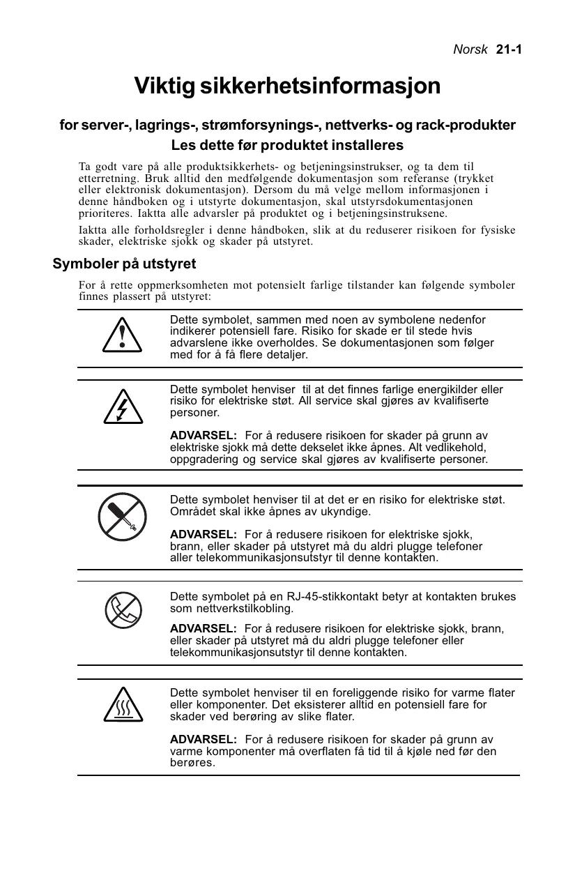 Ikke utfør et høyere reparasjonsnivå enn det som spesifiseres i prosedyrene i produktdokumentasjonen. Feilsøkings- og reparasjonsprosedyrer gir kun informasjon om reparasjoner på delmontasje- og modulnivå. De enkelte kretskortene og delmontasjene er svært komplekse. Derfor skal det ikke foretas reparasjoner på komponentnivå eller modifisering av de trykte kretskortene. Uriktig utførte reparasjoner kan skape en sikkerhetsrisiko. For produkter som står på gulvet; installer og trekk ut bunnstabilisatorene før du monterer tilleggsutstyr og -kort. Forsikre deg om at den grenkretsen fra AC-strømforsyningen som gir strøm til racket ikke er overbelastet. Dette vil redusere risikoen for personskader, brann eller skader på utstyret. Rackets totale last må ikke overskride 80 prosent av grenkretsens maksimalstrøm. Rådfør deg med den instans som kjenner lovgivningen angående krav til ledningsføring og installering. Forholdsregler for strømforsyningsprodukter Strømledninger For å redusere risikoen for elektriske støt eller skader på utstyret: ■ Bruk en godkjent strømledning. ■ Hvis du ikke har mottatt en strømledning for din datamaskin eller annet tilleggsutstyr for vekselstrøm som skal brukes i tilknytning til produktet, må du sørge for å skaffe en ledning som er godkjent for bruk i ditt land. ■ Du må bruke en strømledning som er beregnet for det aktuelle produktet, og den spenning og strøm som er oppgitt på produktets klassifiseringsetikett. De verdiene for strøm og spenning som er angitt for ledningen må være større enn tilsvarende verdier på produktets klassifiseringsetikett. ■ Kontakt en HP Autorisert Serviceleverandør hvis du er i tvil om hvilken type strømledning som skal benyttes. ■ Ikke plasser gjenstander på AC-strømledninger eller -kabler. Tilrettelegg disse slik at de ikke blir tråkket på, eller snublet i, ved et uhell. ■ Trekk aldri i selve ledningen eller kabelen. Trekk i pluggen når ledningen skal kobles fra det elektriske uttaket. ■ Forsikre deg om at det totale strømforbruket for alle produktene som er koblet til en og samme skjøteledning ikke overskrider 80 prosent av den maksimalt tillatte strøm for skjøteledningen eller strømlinjen. ■ Ikke sett strømledningens jordingsplugg ut av drift. Jordingspluggen er en viktig sikkerhetsfaktor. ■ Koble strømledningen til et lett tilgjengelig og jordet elektrisk uttak. Strømforsyninger ■ Strømforsyninger med strømførende plugger skal ikke fjernes eller installeres mens AC-nettspenningen er koblet til strømforsyningen. For å redusere risikoen for elektriske støt eller skader på utstyret når du håndterer strømforsyninger med strømførende plugger: q Installer strømforsyningen før strømledningen kobles til denne. q Koble fra strømledningen før strømforsyningen fjernes fra produktet. q Hvis systemet er utstyrt med flere strømkilder må alle AC-strømledninger kobles fra strømforsyningene for å gjøre systemet fullstendig strømfritt. ■ Forsikre deg om at den eksterne strømforsyningen som er koblet til det aktuelle produktet er i samsvar med de kravene til strømforsyning som er angitt på produktets klassifiseringsetikett. Kontakt en HP Autorisert Serviceleverandør, eller din lokale kraftleverandør, hvis du ikke er sikker på hva slags strømforsyning som kreves. Avbruddsfrie strømforsyninger (UPS) ■ Iaktta følgende for å redusere risikoen for elektriske støt og/eller skader på utstyret under installering eller service på UPS-produkter: q Installering av interne alternativer, rutinevedlikehold og service på UPS-produkter skal kun utføres av kompetente serviceteknikere som kjenner til de prosedyrer, forholdsregler og farer som er knyttet til AC-strømforsyningsutstyr. q For fastkoblede UPS-produkter er det nødvendig med direkte tilkobling til en dedikert vekselstrøms-grenkrets (AC-nett). Tilkobling skal kun foretas av en godkjent elektriker i samsvar med National Electrical Code (NFPA70 Article 310), i Nord-Amerika, eller tilsvarende lokale og nasjonale forskrifter for elektriske installasjoner. 21-4 Norsk Bruk en låse- og avmerkingsprosedyre for å isolere et fastkoblet UPS-produkt fra AC-nettet før det foretas service, eller utskifting av en pluggkomponent som ikke er strømførende, på produktet. q En UPS må aldri betjenes uten at den er tilkoblet AC-strømforsyningen. Bruk TEST/ALARM RESET-knappen for å teste batteriene. Koble fra alle beskyttede laster før UPSen kobles fra AC-strømforsyningen. q Pluggbare UPS-produkter må kobles fra AC-nettet før det foretas service på, eller utskifting av, pluggkomponenter som ikke er strømførende. q Ikke overbelast UPS-enhetens utgang. Den totale tilkoblede lasten må ikke overskride 80 prosent av beregnet utgangsbelastning. q Ikke overskride lekkasjestrømgrensen for den type UPS som brukes i systemet. Se kapittelet Jording - lekkasjestrøm lengre bak i dette dokumentet angående grenser. q Ved installering av rack-produkter må du ikke overskride det maksimale antall UPS-produkter som kan monteres i ett og samme utstyrsrack. q Ved installering må UPS-enheten alltid plasseres i bunnen av racket. Iaktta følgende for å redusere risikoen for personskader eller skader på utstyret under installering av en Remote Emergency Power Off (REPO)-port: q Tilkobling av en REPO-port må utføres av en godkjent elektriker. q Verifiser at frakoblinginnretningen for UPS-enhetens AC-nettspenning er låst og/eller merket i AV-posisjon før det foretas ledningsføring på REPO-porten. q I Nord-Amerika må REPO-kretsen være i samsvar med NEC (NFPA 70, article 725) for klasse- 2 kretser. I andre geografiske regioner eller land må tilkoblingen av REPO-porten være i samsvar med lokale forskrifter og regelverk for det landet hvor produktet er installert. Iaktta følgende for å redusere risikoen for personskader på grunn av elektriske støt, eller skader på utstyret, i forbindelse med installering ell