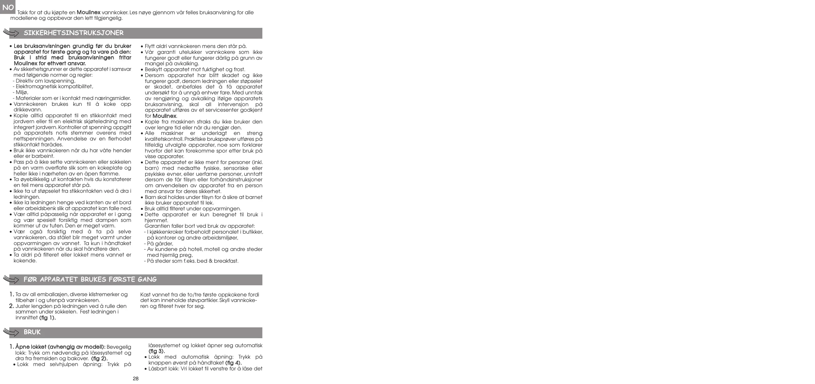 NO Takk for at du kjøpte en M o uli ne x vannkoker. Les nøye gjennom vår felles bruksanvisning for alle modellene og oppbevar den lett tilgjengelig.