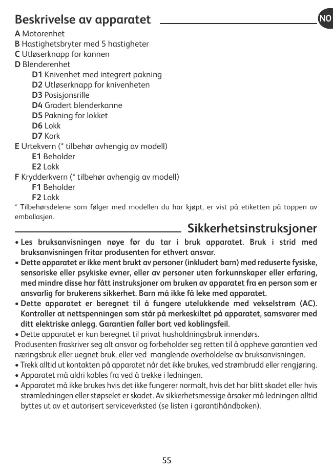 D3 Nervure de positionnement D4 Bol blender verre gradué D5 Joint de couvercle D6 Couvercle D7 Bouchon • Lisez attentivement le mode d'emploi avant une première utilisation de votre appareil, une utilisation non conforme au mode d'emploi dégagerait le fabricant de toute responsabilité. • Cet appareil n'est pas prévu pour être utilisé par des personnes (y compris les enfants) dont les capacités physiques, sensorielles ou mentales sont réduites, ou des personnes dénuées d'expérience ou de connaissance, sauf si elles ont pu bénéficier, par l'intermédiaire d'une personne responsable de leur sécurité, d'une surveillance ou d'instruction préalable concernant l'utilisation de l'appareil. Il convient de surveiller les enfants et de s'assurer qu'ils ne jouent pas avec l'appareil. • L'appareil est conçu pour fonctionner uniquement sur courant alternatif. Vérifiez que la tension d'alimentation indiquée sur la plaque signalétique de l'appareil correspond bien à celle de votre installation électrique, toute erreur de branchement annule la garantie. • Cet appareil est exclusivement destiné à un usage domestique, à l'intérieur de la maison. Le fabricant décline toute responsabilité et se réserve le droit de résilier la garantie en cas d'utilisation commerciale ou inadaptée, ou de non-respect des consignes. • Débranchez toujours l'appareil dès que vous cessez de l'utiliser, en cas de coupure de courant et lorsque vous le nettoyez. • Ne tirez jamais sur le cordon pour débranchez l'appareil. • N'utilisez pas votre appareil s'il ne fonctionne pas correctement, s'il a été endommagé ou si le câble d'alimentation ou la fiche sont endommagés. Afin d'éviter tout danger faites obligatoirement remplacer le cordon par un centre service agréé (voir liste dans le livret de garantie). 1