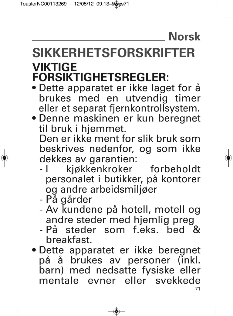 ToasterNC00113269_- 12/05/12 09:13 Page71 Norsk SIKKERHETSFORSKRIFTER VIKTIGE FORSIKTIGHETSREGLER: