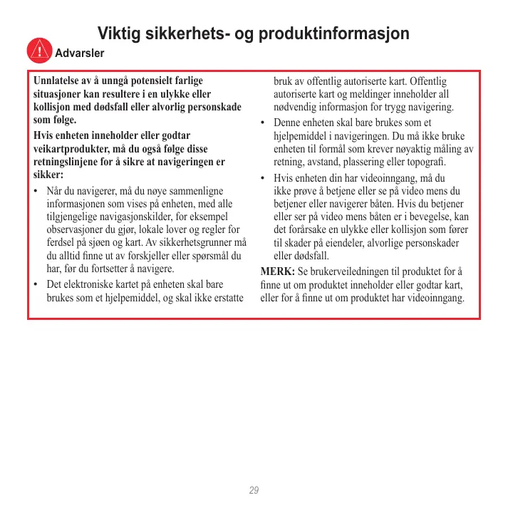 Informations importantes relatives au produit et à la sécurité5 Informazioni importanti sulla sicurezza e sul prodotto8 Wichtige Sicherheits- und Produktinformationen 11 Información importante sobre el producto y tu seguridad14 Informações importantes de segurança e do produto17 Belangrijke veiligheids- en productinformatie20 Vigtige produkt- og sikkerhedsinformationer23 Tärkeitä turvallisuus- ja tuotetietoja26 • En cours de navigation, comparez attentivement les informations affichées à l’écran de l’appareil aux autres sources d’informations, notamment les signaux visuels, les règles et restrictions locales relatives aux voies navigables, ainsi que les cartes. Pour votre sécurité, cherchez à résoudre tout dysfonctionnement ou problème avant de poursuivre la navigation. • Utilisez le diagramme électronique de l’appareil uniquement pour faciliter l’usage de diagrammes officiels du gouvernement, pas pour les remplacer. Seuls les diagrammes officiels et les