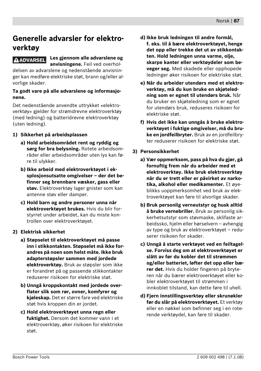 a) Ikke overbelast verktøyet. Bruk et elektroverktøy som er beregnet til den type arbeid du vil utføre. Med et passende elektroverktøy arbeider du bedre og sikrere i det angitte effektområdet. b) Ikke bruk elektroverktøy med defekt på-/av-bryter. Et elektroverktøy som ikke lenger kan slås av eller på, er farlig og må repareres. c) Trekk støpselet ut av stikkontakten og/eller fjern batteriet før du utfører innstillinger på elektroverktøyet, skifter tilbehørsdeler eller legger maskinen bort. Disse tiltakene forhindrer en utilsiktet starting av elektroverktøyet. d) Elektroverktøy som ikke er i bruk må oppbevares utilgjengelig for barn. Ikke la maskinen brukes av personer som ikke er fortrolig med dette eller ikke har lest disse anvisningene. Elektroverktøy er farlige når de brukes av uerfarne personer. e) Vær nøye med vedlikeholdet av elektroverktøyet. Kontroller om bevegelige verktøydeler fungerer feilfritt og ikke klemmes fast, og om deler er brukket eller skadet, slik at dette innvirker på elektroverktøyets funksjon. La disse skadede delene repareres før elektroverktøyet brukes. Dårlig vedlikeholdte elektroverktøy er årsaken til mange uhell. 2 609 002 498 | (7.1.08)