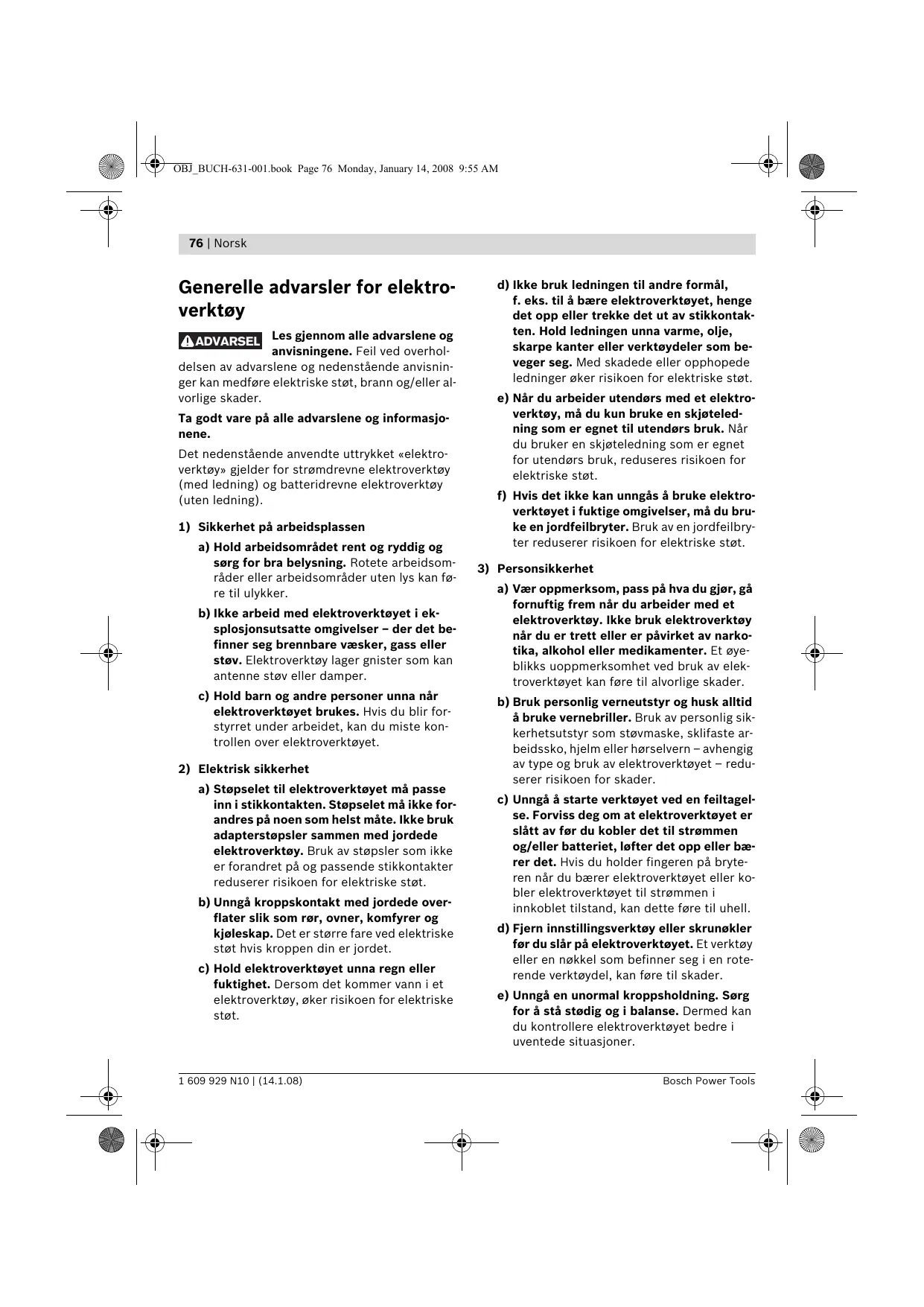 a) Vær oppmerksom, pass på hva du gjør, gå fornuftig frem når du arbeider med et elektroverktøy. Ikke bruk elektroverktøy når du er trett eller er påvirket av narkotika, alkohol eller medikamenter. Et øyeblikks uoppmerksomhet ved bruk av elektroverktøyet kan føre til alvorlige skader. b) Bruk personlig verneutstyr og husk alltid å bruke vernebriller. Bruk av personlig sikkerhetsutstyr som støvmaske, sklifaste arbeidssko, hjelm eller hørselvern – avhengig av type og bruk av elektroverktøyet – reduserer risikoen for skader. c) Unngå å starte verktøyet ved en feiltagelse. Forviss deg om at elektroverktøyet er slått av før du kobler det til strømmen og/eller batteriet, løfter det opp eller bærer det. Hvis du holder fingeren på bryteren når du bærer elektroverktøyet eller kobler elektroverktøyet til strømmen i innkoblet tilstand, kan dette føre til uhell. d) Fjern innstillingsverktøy eller skrunøkler før du slår på elektroverktøyet. Et verktøy eller en nøkkel som befinner seg i en roterende verktøydel, kan føre til skader. e) Unngå en unormal kroppsholdning. Sørg for å stå stødig og i balanse. Dermed kan du kontrollere elektroverktøyet bedre i uventede situasjoner. Bosch Power Tools OBJ_BUCH-631-001.book Page 77 Monday, January 14, 2008 9:55 AM Norsk | 77 f) Bruk alltid egnede klær. Ikke bruk vide klær eller smykker. Hold hår, tøy og hansker unna deler som beveger seg. Løstsittende tøy, smykker eller langt hår kan komme inn i deler som beveger seg. g) Hvis det kan monteres støvavsug- og oppsamlingsinnretninger, må du forvisse deg om at disse er tilkoblet og brukes på korrekt måte. Bruk av et støvavsug reduserer farer på grunn av støv.
