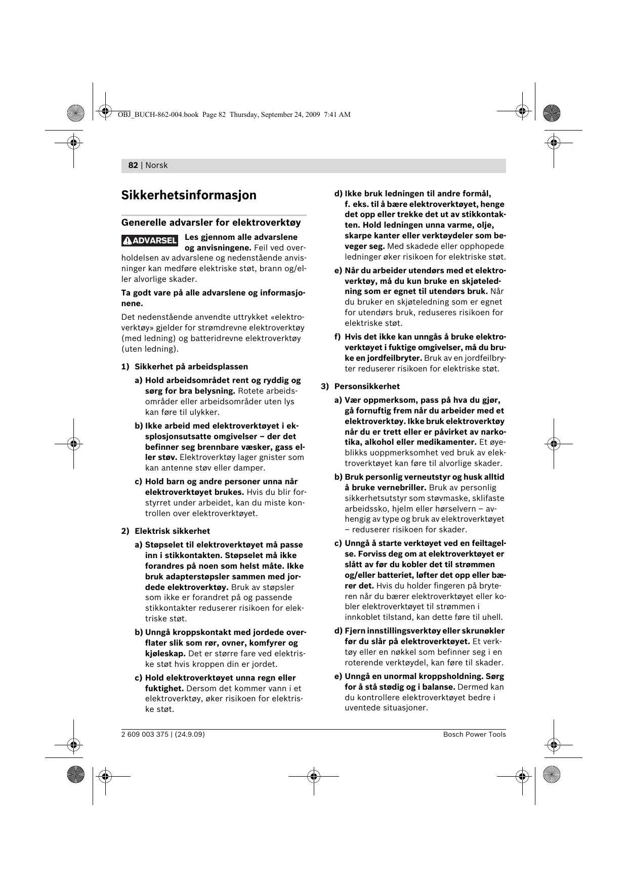 Generelle advarsler for elektroverktøy ADVARSEL Les gjennom alle advarslene og anvisningene. Feil ved overholdelsen av advarslene og nedenstående anvisninger kan medføre elektriske støt, brann og/eller alvorlige skader. Ta godt vare på alle advarslene og informasjonene. Det nedenstående anvendte uttrykket «elektroverktøy» gjelder for strømdrevne elektroverktøy (med ledning) og batteridrevne elektroverktøy (uten ledning). 1) Sikkerhet på arbeidsplassen a) Hold arbeidsområdet rent og ryddig og sørg for bra belysning. Rotete arbeidsområder eller arbeidsområder uten lys kan føre til ulykker. b) Ikke arbeid med elektroverktøyet i eksplosjonsutsatte omgivelser – der det befinner seg brennbare væsker, gass eller støv. Elektroverktøy lager gnister som kan antenne støv eller damper. c) Hold barn og andre personer unna når elektroverktøyet brukes. Hvis du blir forstyrret under arbeidet, kan du miste kontrollen over elektroverktøyet. 2) Elektrisk sikkerhet