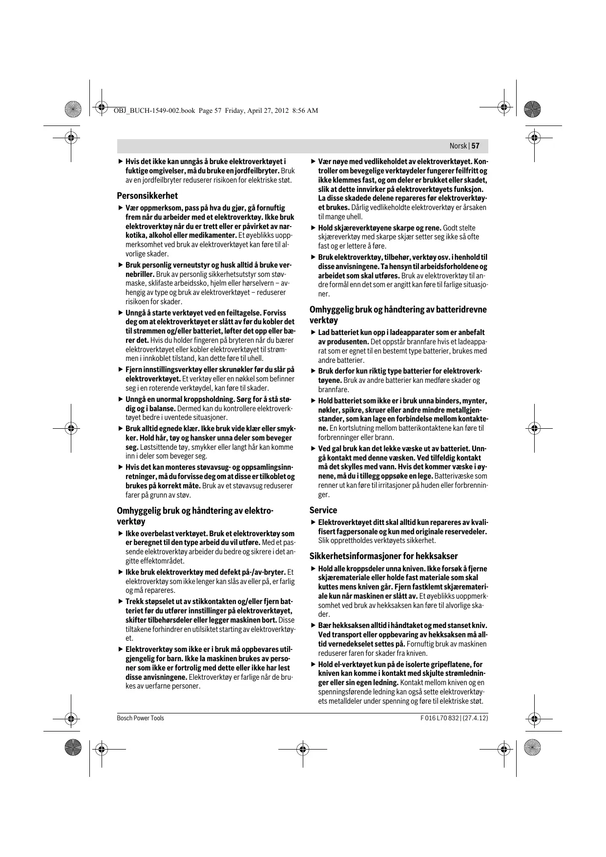 Sågfunktion Även om knivavståndet tillåter klippning av grenar upp till en Ø 26/34 mm, har knivsvärdets nos konstruerats för klippning upp till en Ø 26/34 mm. Felsökning Symptom Möjlig orsak Åtgärd Häcksaxen startar inte Nätspänning saknas Kontrollera och slå på Nätuttaget defekt Använd ett annat nätuttag Den fast anslutna nätsladden har skadats Kontrollera försiktigt den fast anslutna nätsladden; uppsök kundtjänsten för byte Häcksaxen går med avbrott Den separata skarvsladden har skadats Kontrollera skarvsladden och byt ut om den skadats Säkringen har löst ut Byt ut säkringen Den fast anslutna nätsladden har skadats Kontrollera försiktigt den fast anslutna nätsladden; uppsök kundtjänsten för byte Den separata skarvsladden har skadats Kontrollera skarvsladden och byt ut om den skadats Trädgårdsredskapets inre kablar defekta Uppsök kundservicen Strömställaren defekt Motorn går, knivarna står Internt fel stilla Bosch Power Tools Uppsök kundservicen Uppsök kundservicen F 016 L70 832 | (27.4.12) OBJ_BUCH-1549-002.book Page 56 Friday, April 27, 2012 8:56 AM 56 | Norsk Symptom Möjlig orsak Knivarna blir heta Kniven är trubbig Åtgärd Låt knivsvärdet slipas Kniven har skåror i eggen Kontrollera knivsvärdet För hög friktion till följd av bristfällig smörj- Spreja med smörjolja ning Kraftiga vibrationer/buller Trädgårdsredskapet är defekt Kundservice och kundkonsulter www.bosch-garden.com Ange alltid vid förfrågningar och reservdelsbeställningar det 10-siffriga produktnumret som finns på elverktygets typskylt. Svenska Bosch Service Center Telegrafvej 3 2750 Ballerup Danmark Tel.: +46 (020) 41 44 55 Fax: +46 (011) 18 76 91 Avfallshantering Släng inte elverktyg i hushållsavfall! Endast för EU-länder: Enligt europeiska direktivet 2002/96/EG för kasserade elektriska och elektroniska apparater och dess modifiering till nationell rätt måste obrukbara elverktyg omhändertas separat och på miljövänligt sätt lämnas in för återvinning. Ändringar förbehålles. Norsk Sikkerhetsinformasjon Forklaring av bildesymbolene Les gjennom denne driftsinstruksen. Ikke bruk hekksaksen i regn. Ikke utsett hekksaksen for regn. Slå av hekksaksen og trekk støpselet ut av stikkkontakten før du utfører innstillinger eller en rengjøring, hvis ledningen har hopet seg opp, er kappet eller skadet eller hvis du må la hekksaksen stå uten oppsyn – også hvis det kun er en kort stund. Bruk hørselvern. F 016 L70 832 | (27.4.12) Uppsök kundservicen Generelle advarsler for elektroverktøy ADVARSEL Les gjennom alle advarslene og anvisningene. Feil ved overholdelsen av advarslene og nedenstående anvisninger kan medføre elektriske støt, brann og/eller alvorlige skader. Ta godt vare på alle advarslene og informasjonene. Det nedenstående anvendte uttrykket «elektroverktøy» gjelder for strømdrevne elektroverktøy (med ledning) og batteridrevne elektroverktøy (uten ledning). Sikkerhet på arbeidsplassen f Hold arbeidsområdet rent og ryddig og sørg for bra belysning. Rotete arbeidsområder eller arbeidsområder uten lys kan føre til ulykker. f Ikke arbeid med elektroverktøyet i eksplosjonsutsatte omgivelser – der det befinner seg brennbare væsker, gass eller støv. Elektroverktøy lager gnister som kan antenne støv eller damper. f Hold barn og andre personer unna når elektroverktøyet brukes. Hvis du blir forstyrret under arbeidet, kan du miste kontrollen over elektroverktøyet. Elektrisk sikkerhet f Støpselet til elektroverktøyet må passe inn i stikkontakten. Støpselet må ikke forandres på noen som helst måte. Ikke bruk adapterstøpsler sammen med jordede elektroverktøy. Bruk av støpsler som ikke er forandret på og passende stikkontakter reduserer risikoen for elektriske støt. f Unngå kroppskontakt med jordede overflater slik som rør, ovner, komfyrer og kjøleskap. Det er større fare ved elektriske støt hvis kroppen din er jordet. f Hold elektroverktøyet unna regn eller fuktighet. Dersom det kommer vann i et elektroverktøy, øker risikoen for elektriske støt. f Ikke bruk ledningen til andre formål, f. eks. til å bære elektroverktøyet, henge det opp eller trekke det ut av stikkontakten. Hold ledningen unna varme, olje, skarpe kanter eller verktøydeler som beveger seg. Med skadede eller opphopede ledninger øker risikoen for elektriske støt. f Når du arbeider utendørs med et elektroverktøy, må du kun bruke en skjøteledning som er egnet til utendørs bruk. Når du bruker en skjøteledning som er egnet for utendørs bruk, reduseres risikoen for elektriske støt. Bosch Power Tools OBJ_BUCH-1549-002.book Page 57 Friday, April 27, 2012 8:56 AM Norsk | 57 f Hvis det ikke kan unngås å bruke elektroverktøyet i fuktige omgivelser, må du bruke en jordfeilbryter. Bruk av en jordfeilbryter reduserer risikoen for elektriske støt. Personsikkerhet f Vær oppmerksom, pass på hva du gjør, gå fornuftig frem når du arbeider med et elektroverktøy. Ikke bruk elektroverktøy når du er trett eller er påvirket av narkotika, alkohol eller medikamenter. Et øyeblikks uoppmerksomhet ved bruk av elektroverktøyet kan føre til alvorlige skader. f Bruk personlig verneutstyr og husk alltid å bruke vernebriller. Bruk av personlig sikkerhetsutstyr som støvmaske, sklifaste arbeidssko, hjelm eller hørselvern – avhengig av type og bruk av elektroverktøyet – reduserer risikoen for skader. f Unngå å starte verktøyet ved en feiltagelse. Forviss deg om at elektroverktøyet er slått av før du kobler det til strømmen og/eller batteriet, løfter det opp eller bærer det. Hvis du holder fingeren på bryteren når du bærer elektroverktøyet eller kobler elektroverktøyet til strømmen i innkoblet tilstand, kan dette føre til uhell. f Fjern innstillingsverktøy eller skrunøkler før du slår på elektroverktøyet. Et verktøy eller en nøkkel som befinner seg i en roterende verktøydel, kan føre til skader. f Unngå en un
