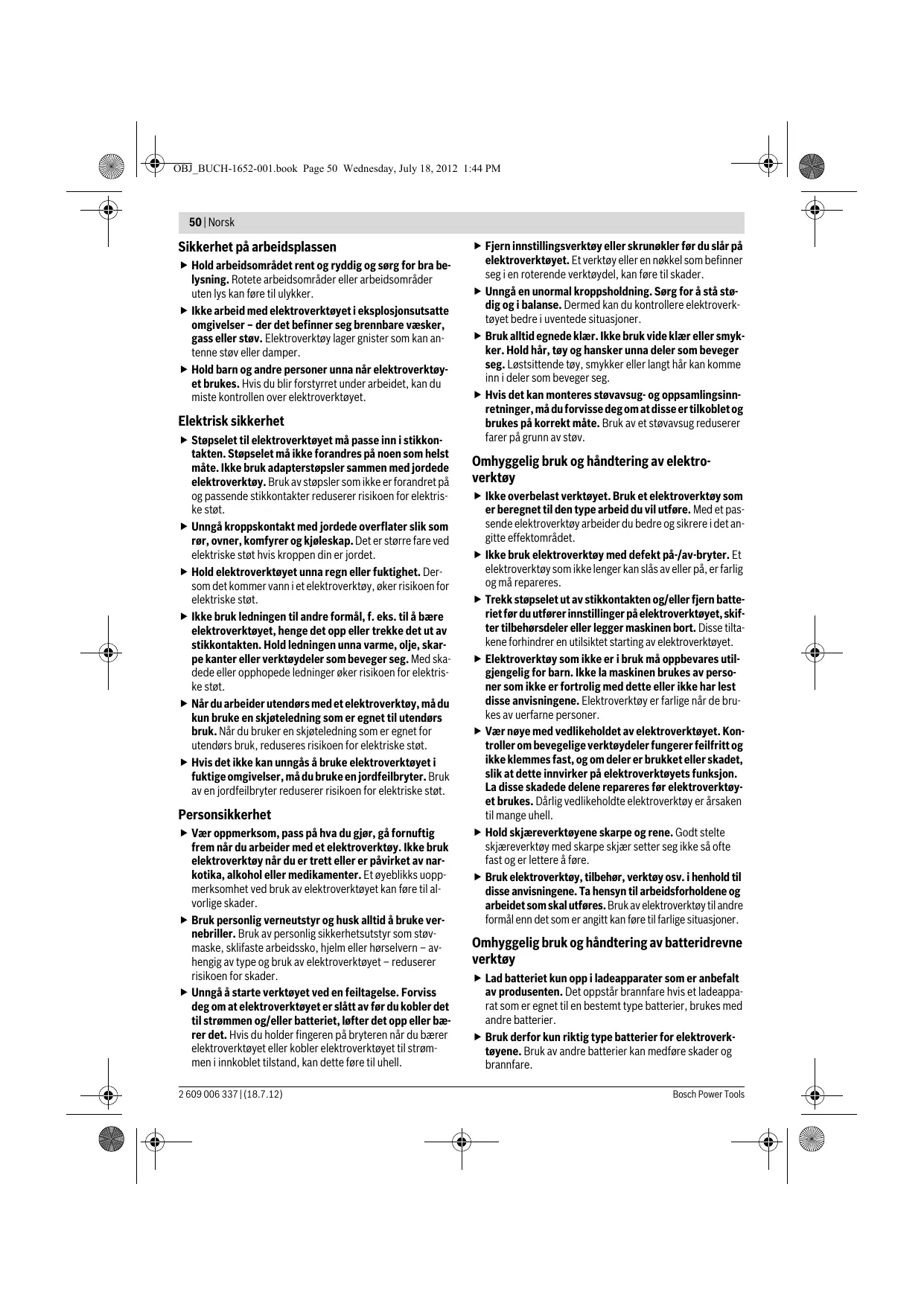 Vedlikehold og rengjøring Transport Li-ion-batteriene i verktøyet underligger kravene for farlig gods. Batteriene kan transporteres på veier av brukeren uten ytterligere krav. Ved forsendelse gjennom tredje personer (f. eks.: lufttransport eller spedisjon) må det oppfylles spesielle krav til emballasje og merking. Du må da konsultere en ekspert for farlig gods ved forberedelse av forsendelsen. Send batterier kun hvis huset ikke er skadet. Lim igjen de åpne kontaktene og pakk batteriet slik at det ikke beveger seg i emballasjen. Ta også hensyn til eventuelle videreførende nasjonale forskrifter. Deponering Elektroverktøy, batterier, tilbehør og emballasje må leveres inn til miljøvennlig gjenvinning. Elektroverktøy og batterier må ikke kastes i vanlig søppel! 2 609 006 337 | (18.7.12)